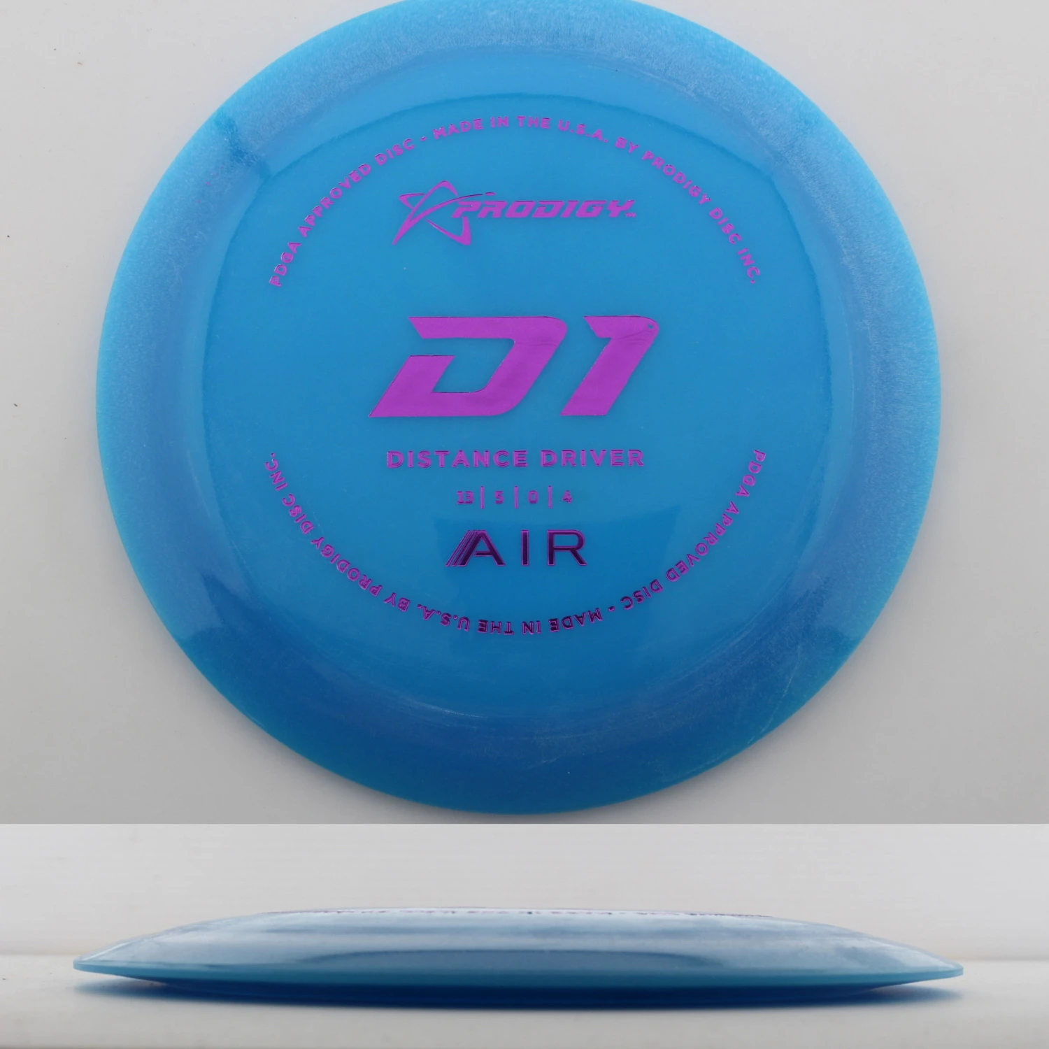 Air D1 – The D1 is an overstable distance driver that can be trusted on power hyzers and headwind shots while still pushing forward down the fairway. Great for flex forehands that you can trust to finish on hyzer. It is a disc that will get glide while still being reliably overstable. The Air plastic is lightweight and perfect for younger players and players that need a little more speed. Grab yourself a Prodigy Discs Air D1 today.
