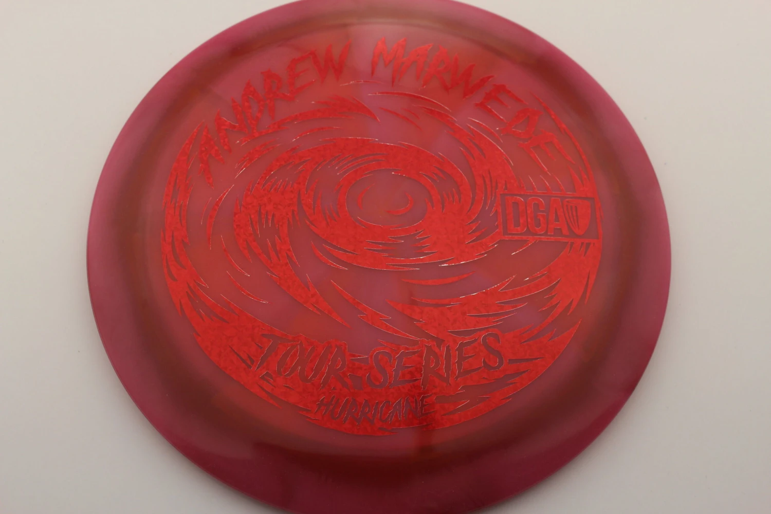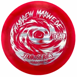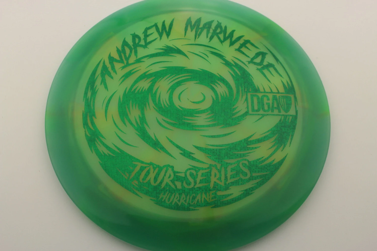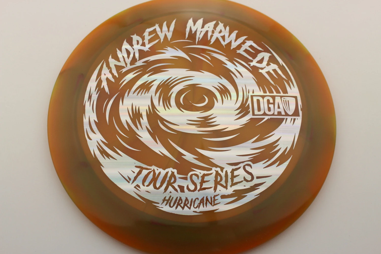 Andrew Marwede Tour Series Swirl Hurricane – The DGA Hurricane is a great feeling and flying disc from DGA that will become your workhorse driver, especially if you have a big arm. The Hurricane is fast and overstable and can be trusted in most all conditions. It has a great feel in the hand and can be thrown with confidence both backhand and forehand. The Tour Series Swirl plastic looks amazing and the artwork really pops off the plastic, making this a head turner. Help support Andrew Marwede with the 2023 Tour Series Swirl Hurricane today and start crushing fairways!