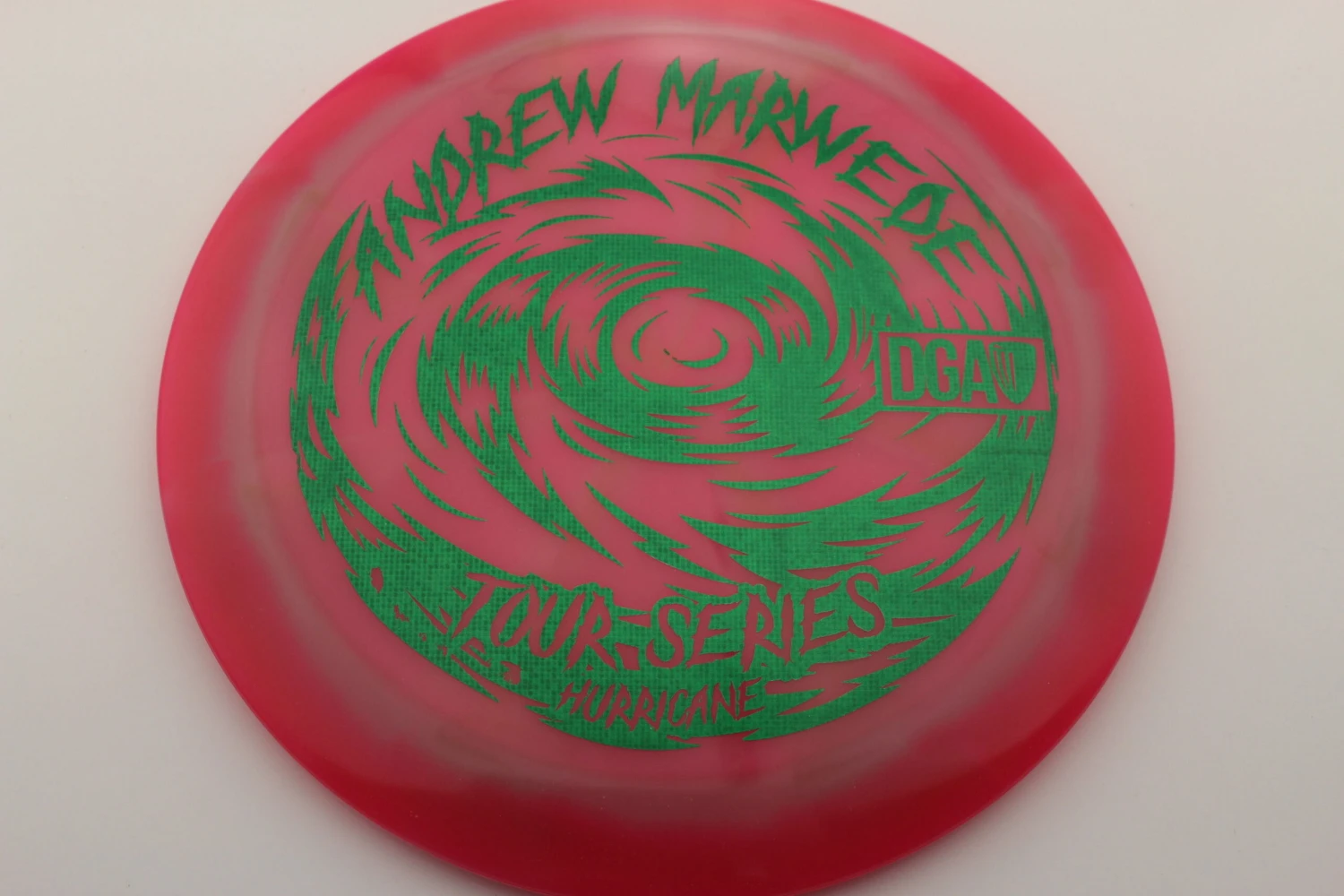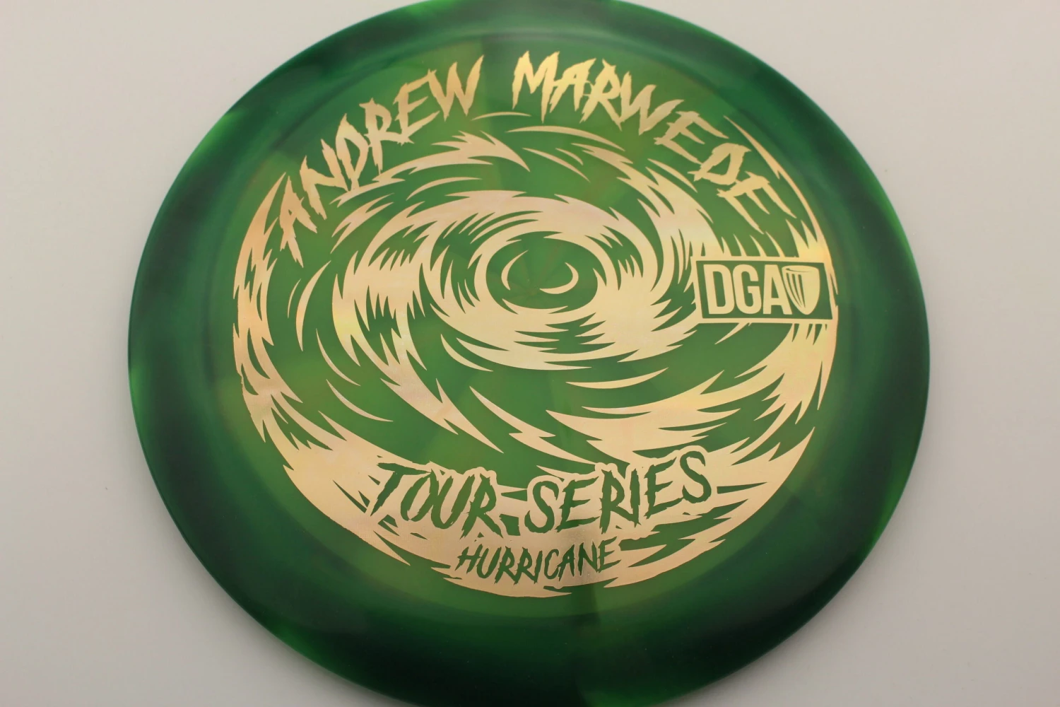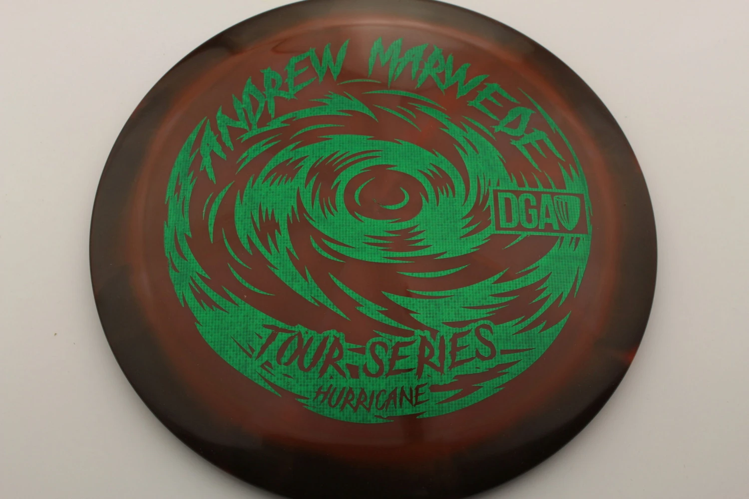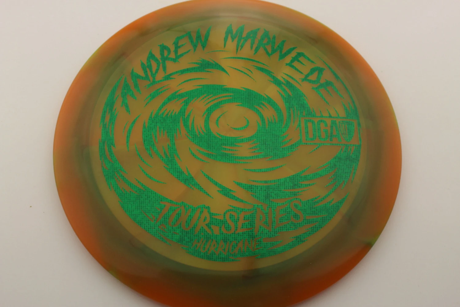 Andrew Marwede Tour Series Swirl Hurricane – The DGA Hurricane is a great feeling and flying disc from DGA that will become your workhorse driver, especially if you have a big arm. The Hurricane is fast and overstable and can be trusted in most all conditions. It has a great feel in the hand and can be thrown with confidence both backhand and forehand. The Tour Series Swirl plastic looks amazing and the artwork really pops off the plastic, making this a head turner. Help support Andrew Marwede with the 2023 Tour Series Swirl Hurricane today and start crushing fairways!