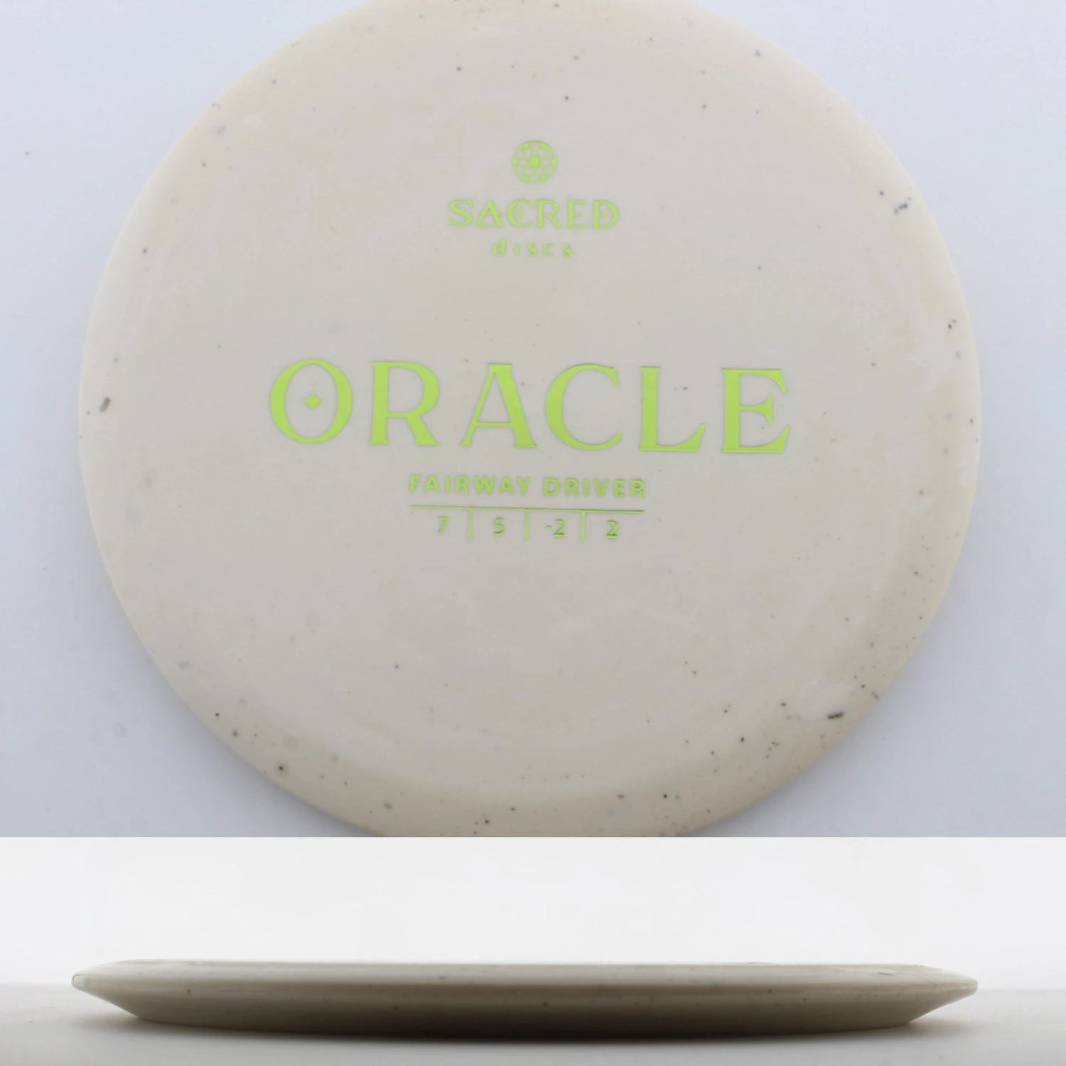 Sacred Discs says this about the slightly understable fairway driver: “The Oracle is an easy to control, hyzer-flip to flat fairway driver. Its thin profile allows it to weave through tight fairways. The Oracle was designed to have the same reliably neutral flight built for players of all skill levels…In Greek mythology, the Oracle refers to several different sources of divine knowledge. The prophecies of the Oracle were highly regarded with kings and leaders often seeking her guidance before making important decisions…Our First Run blends are infused with white sage.”