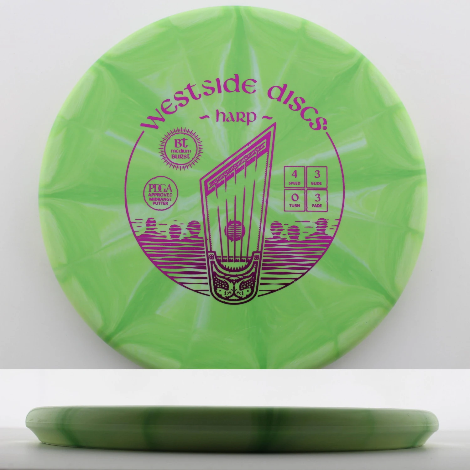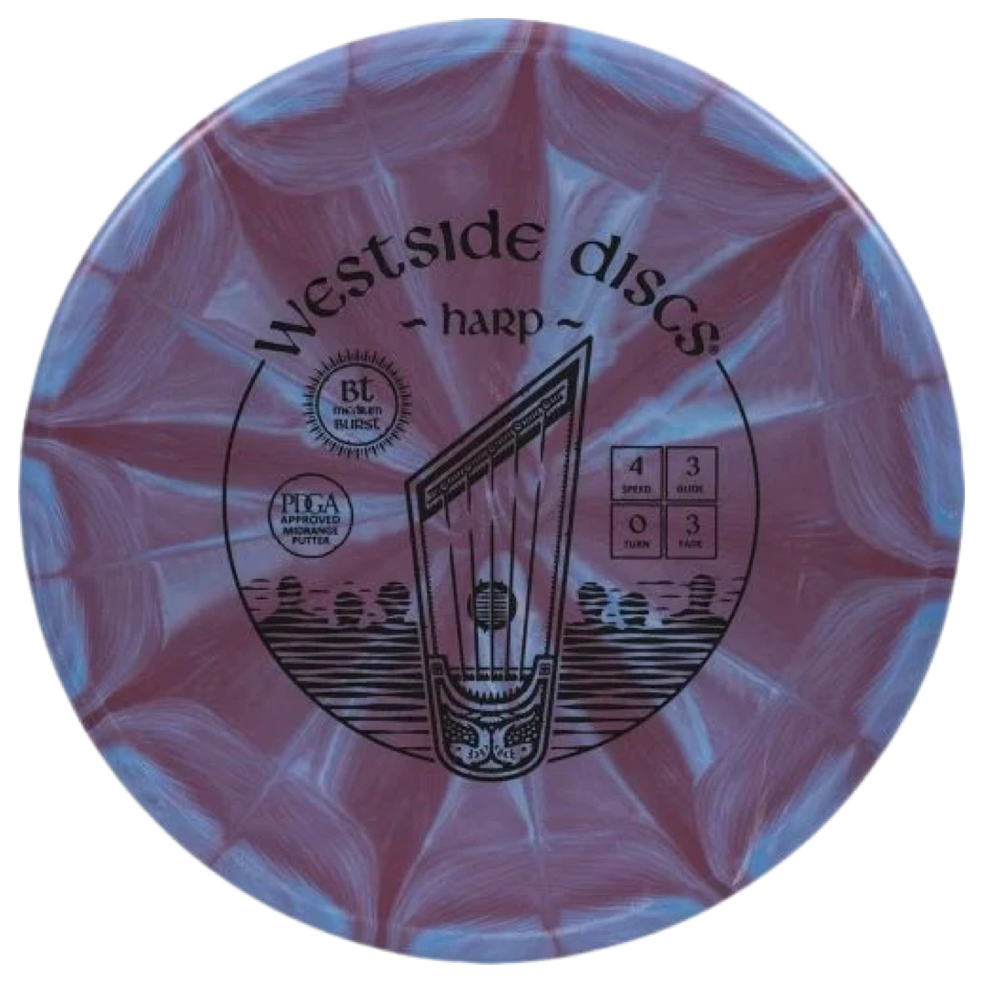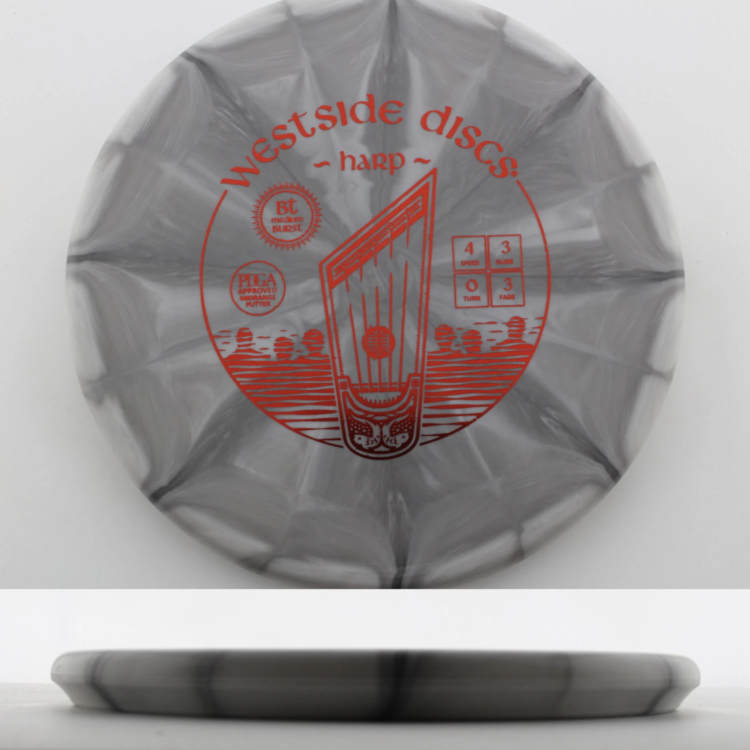 Burst BT Medium Harp – The Harp is one of the best discs on the market (in our humble opinion)!!! It is a very reliable overstable putter. This disc has a very comfortable Beadless grip and finds a nice Overstable flight without a thumbtrac type feen of shots including a deadly forehand for approaches. One of the best discs in the Westside and Trilogy lineup, it is trusted by many players. We over at OTB love the Harp(BT Hard specifically) for forehand approach shots and forehand drives off the tee. It can be used for a variety of different shots due to its great feel in the hand both backhand and forehand, and its stability for a putter. It can handle all the power you can give it, and is great for headwind shots. Grab a Burst BT Medium Harp today!