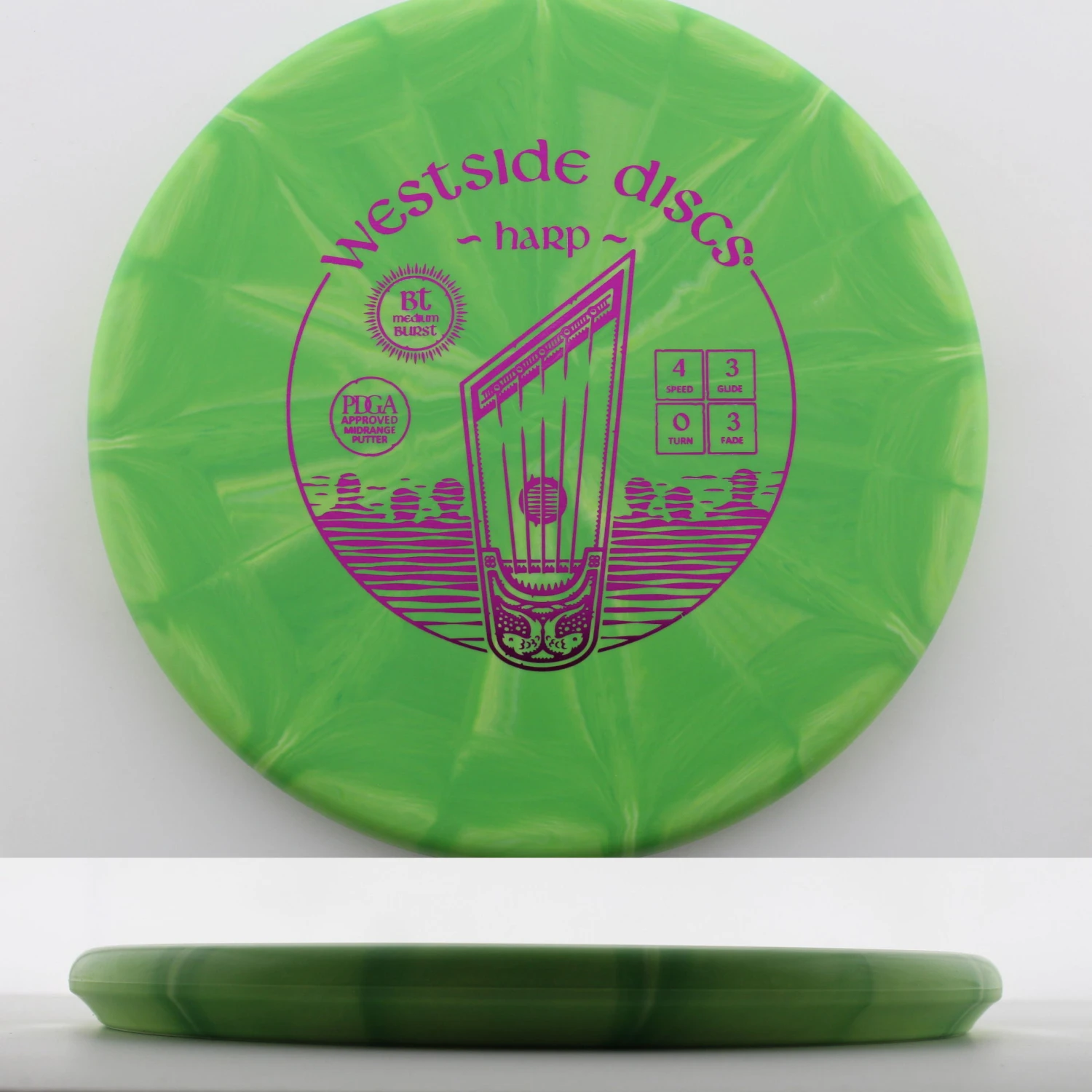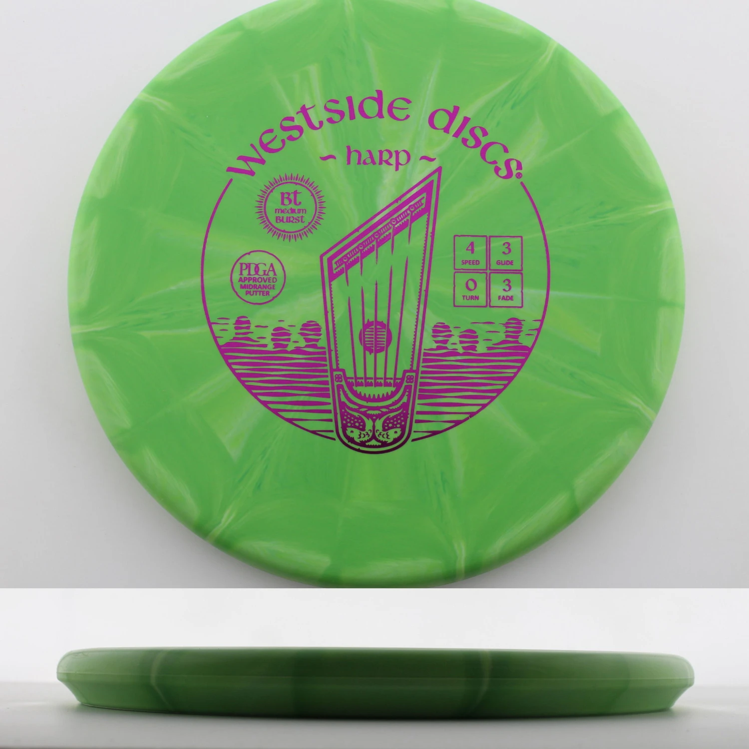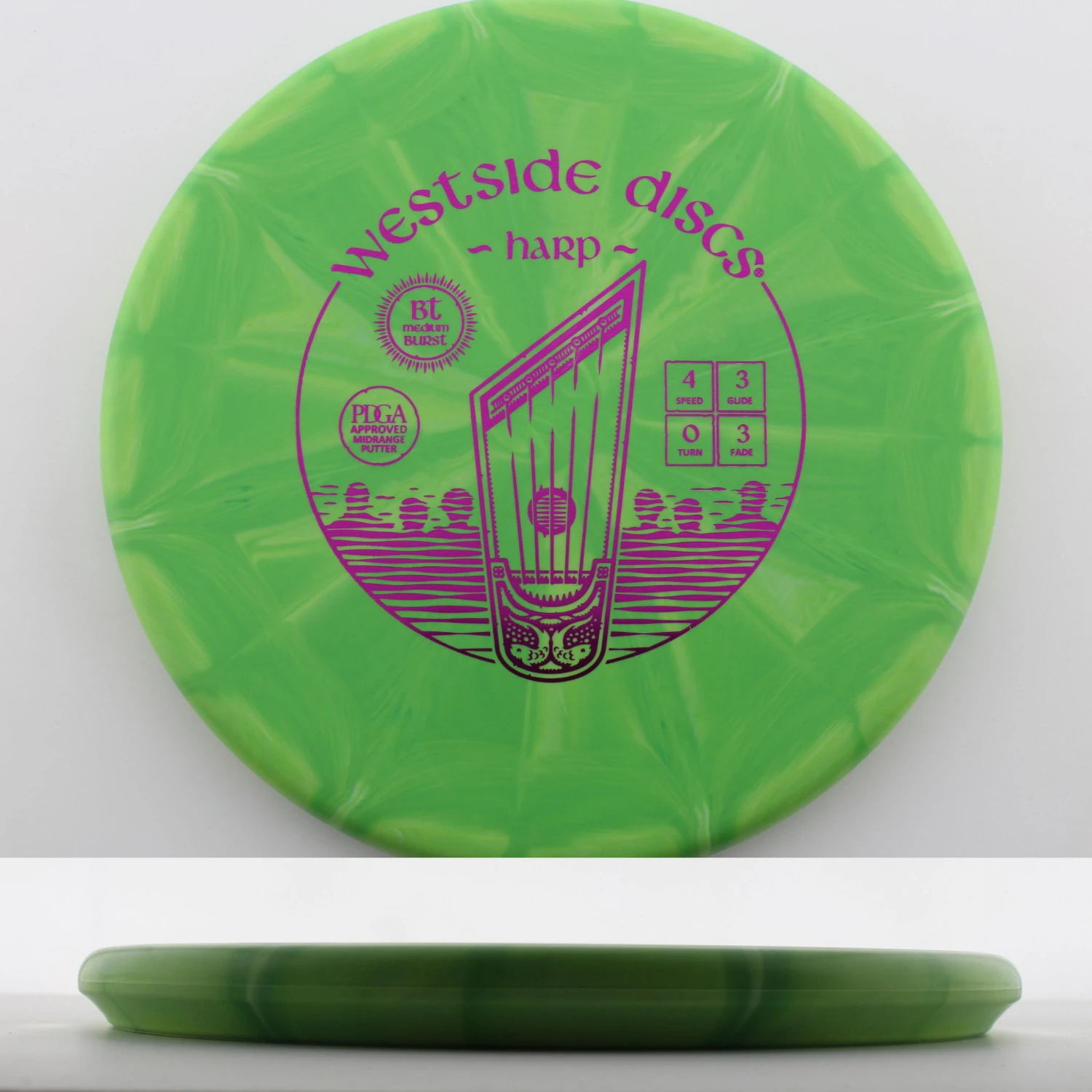 Burst BT Medium Harp – The Harp is one of the best discs on the market (in our humble opinion)!!! It is a very reliable overstable putter. This disc has a very comfortable Beadless grip and finds a nice Overstable flight without a thumbtrac type feen of shots including a deadly forehand for approaches. One of the best discs in the Westside and Trilogy lineup, it is trusted by many players. We over at OTB love the Harp(BT Hard specifically) for forehand approach shots and forehand drives off the tee. It can be used for a variety of different shots due to its great feel in the hand both backhand and forehand, and its stability for a putter. It can handle all the power you can give it, and is great for headwind shots. Grab a Burst BT Medium Harp today!