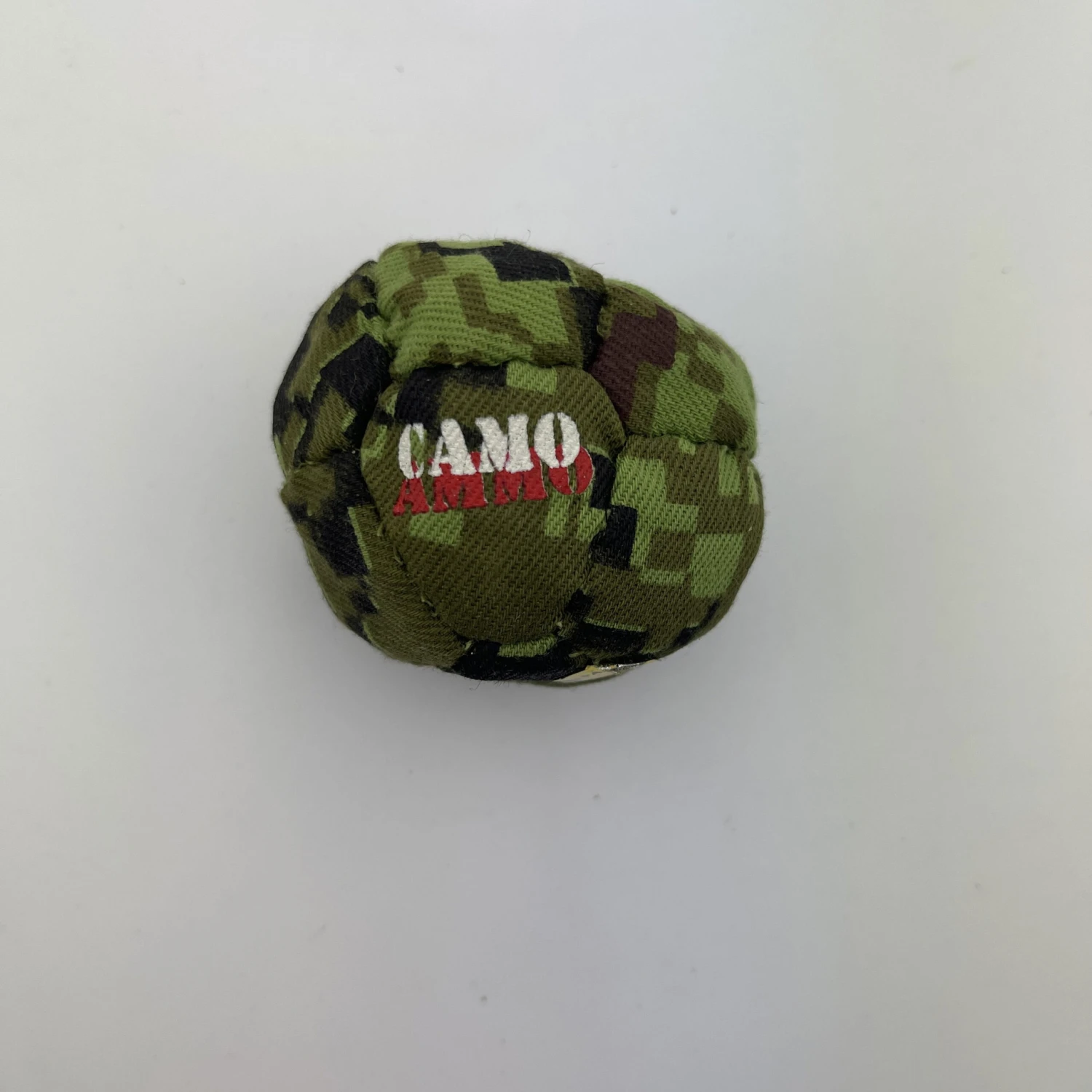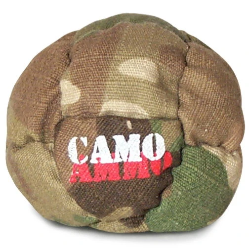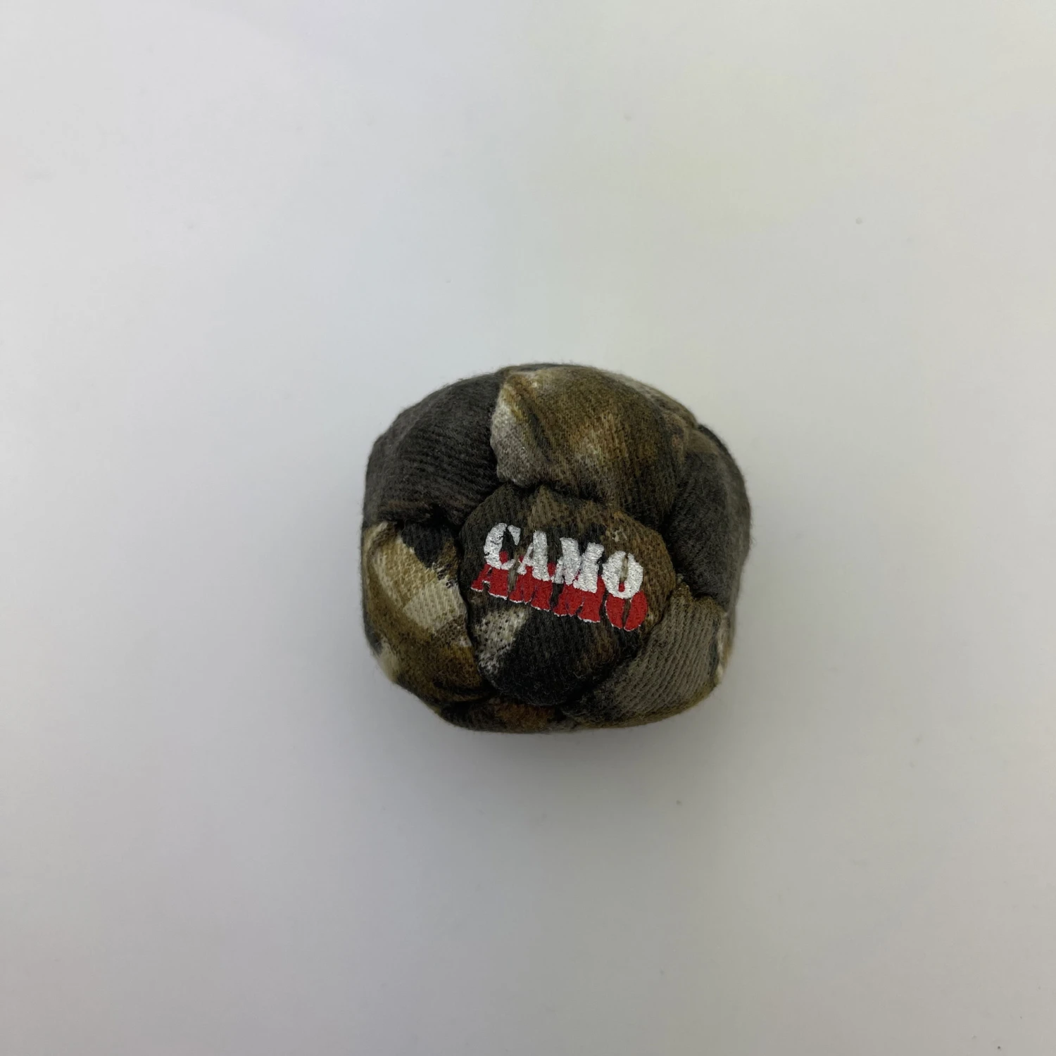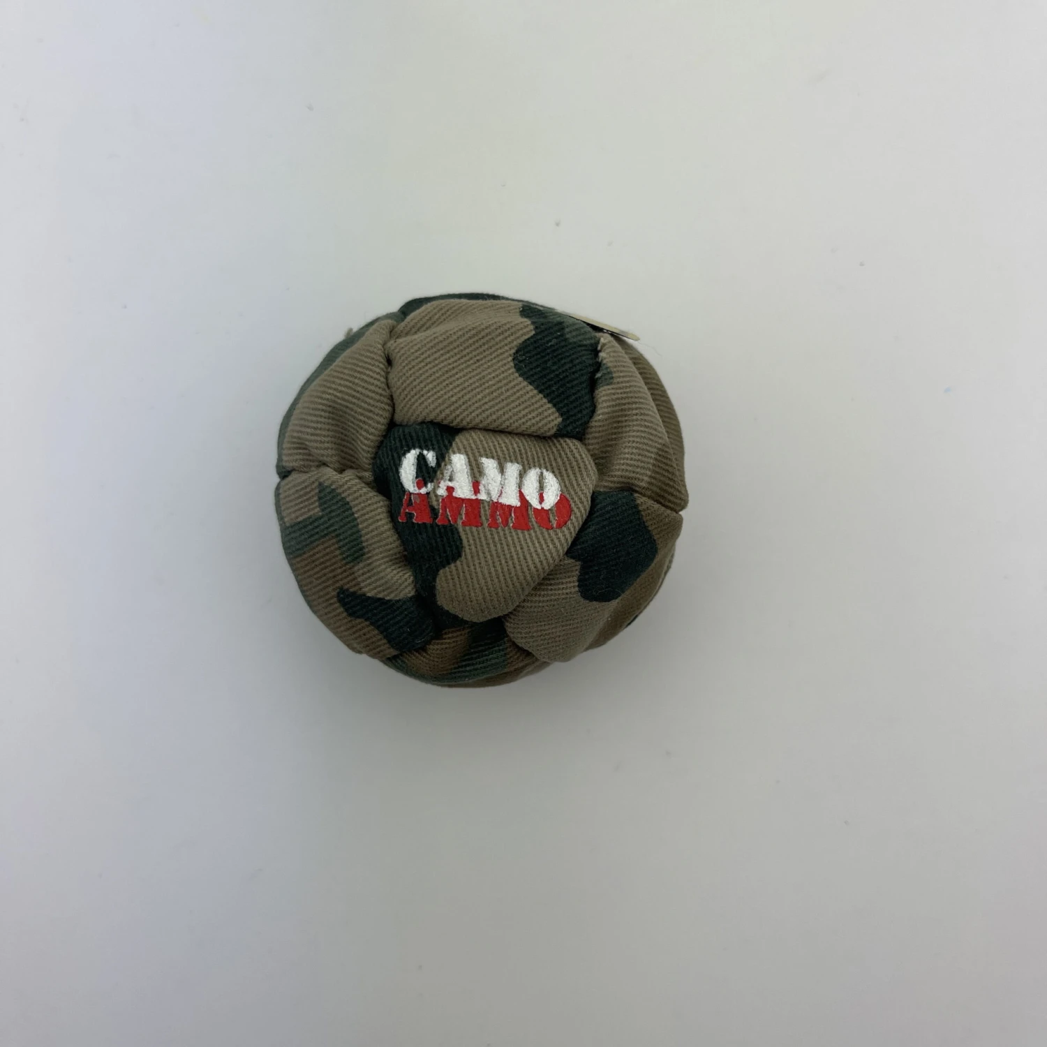 FootWorld says this about the bag: “The Camo Ammo utilizes a classic 14-panel design made famous by Flying Clipper’s Tangent model. A revolutionary filler material with an exacting combination of ground rubber and steel pellets gives the Camo Ammo a fun and lively feel for basic kicks, yet it’s soft enough to delay for freestyle play. The camouflaged outer cover fabric of this heavyweight, 80 gram footbag is tough as a tank, but may be a little difficult to find with an errant kick in the back country when you’re on patrol. We always hope that war is the absolute last resort for solving differences, but we back our military troops 100% for the sometimes thankless job they accept on behalf of our country. World Footbag will award a veterans service organization with a financial contribution from the sale of every Camo Ammo sold. Make your contribution to our military by putting a Camo Ammo into your arsenal.”