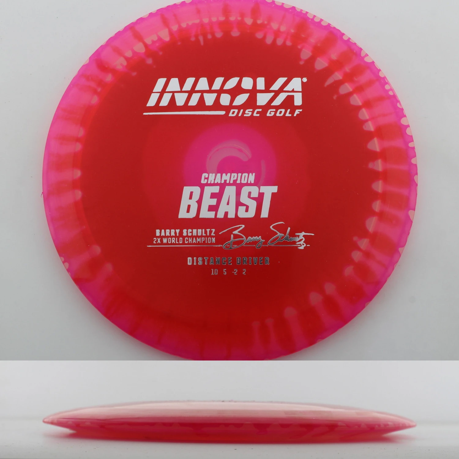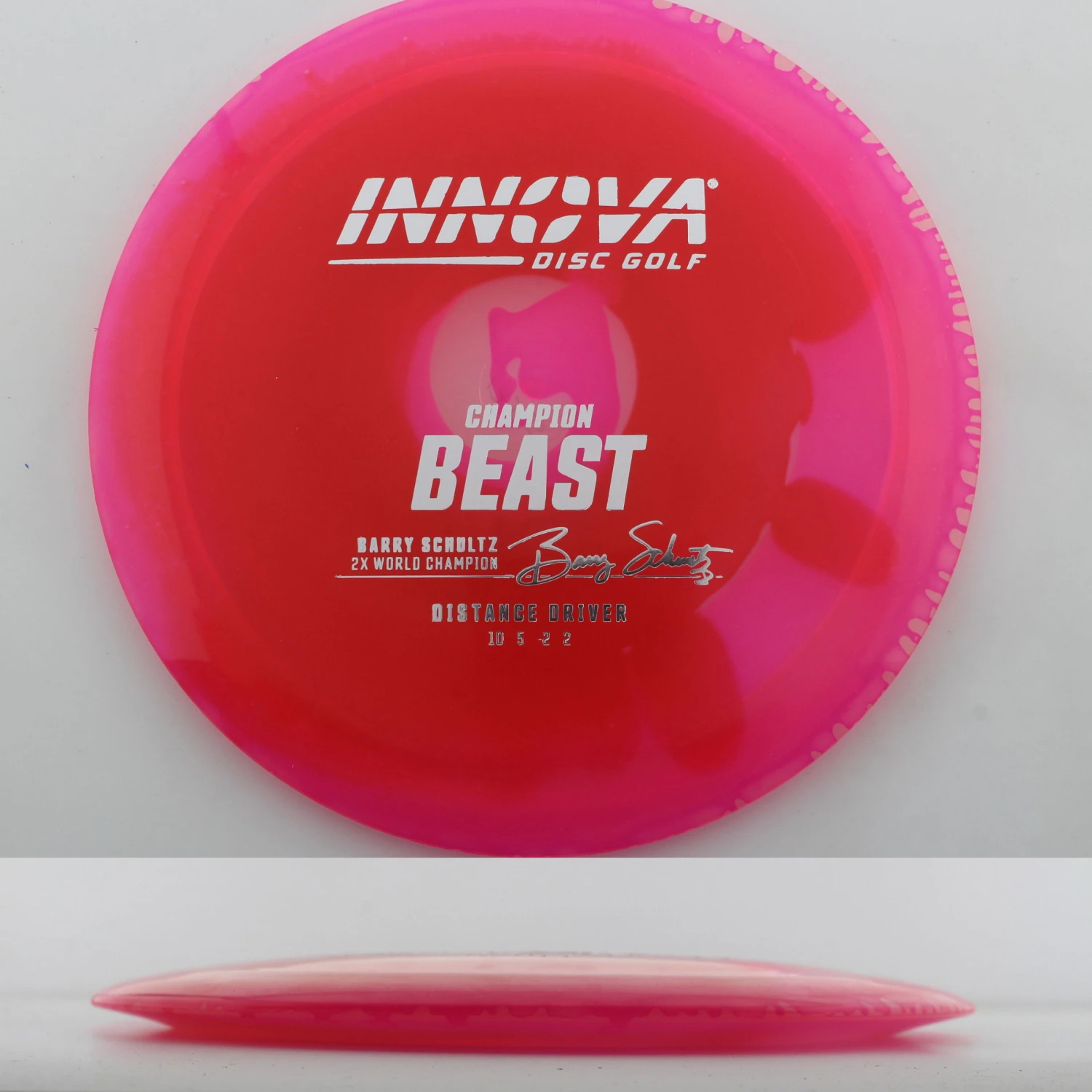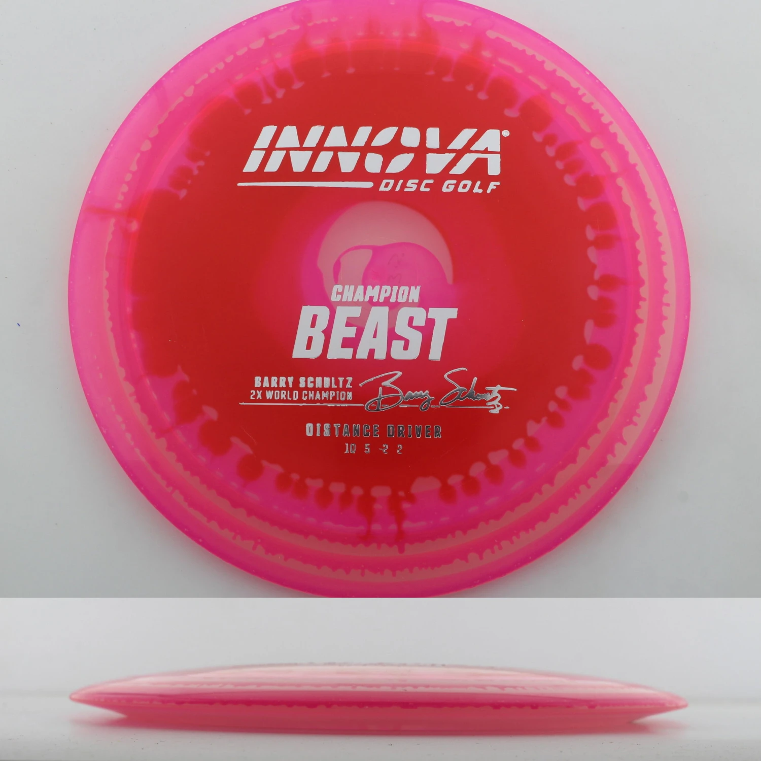 Innova says this about the mold: “The Beast was issued in the era of the wide rimmed driver. It was an instant classic when it was released; giving players more distance using less power. The Beast’s high glide, high speed and high speed turn all combine to give big distance. It is suitable for beginners and pros alike. The Champion Beast is endorsed by two-time World Champion Barry Schultz.”