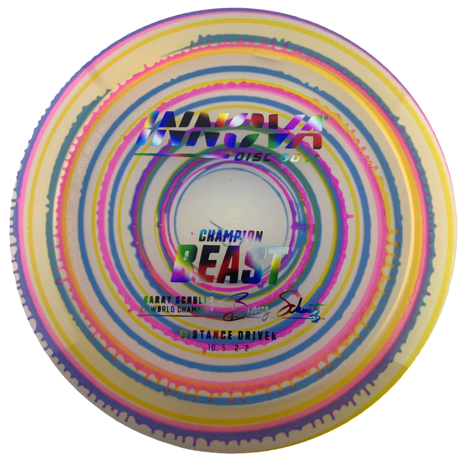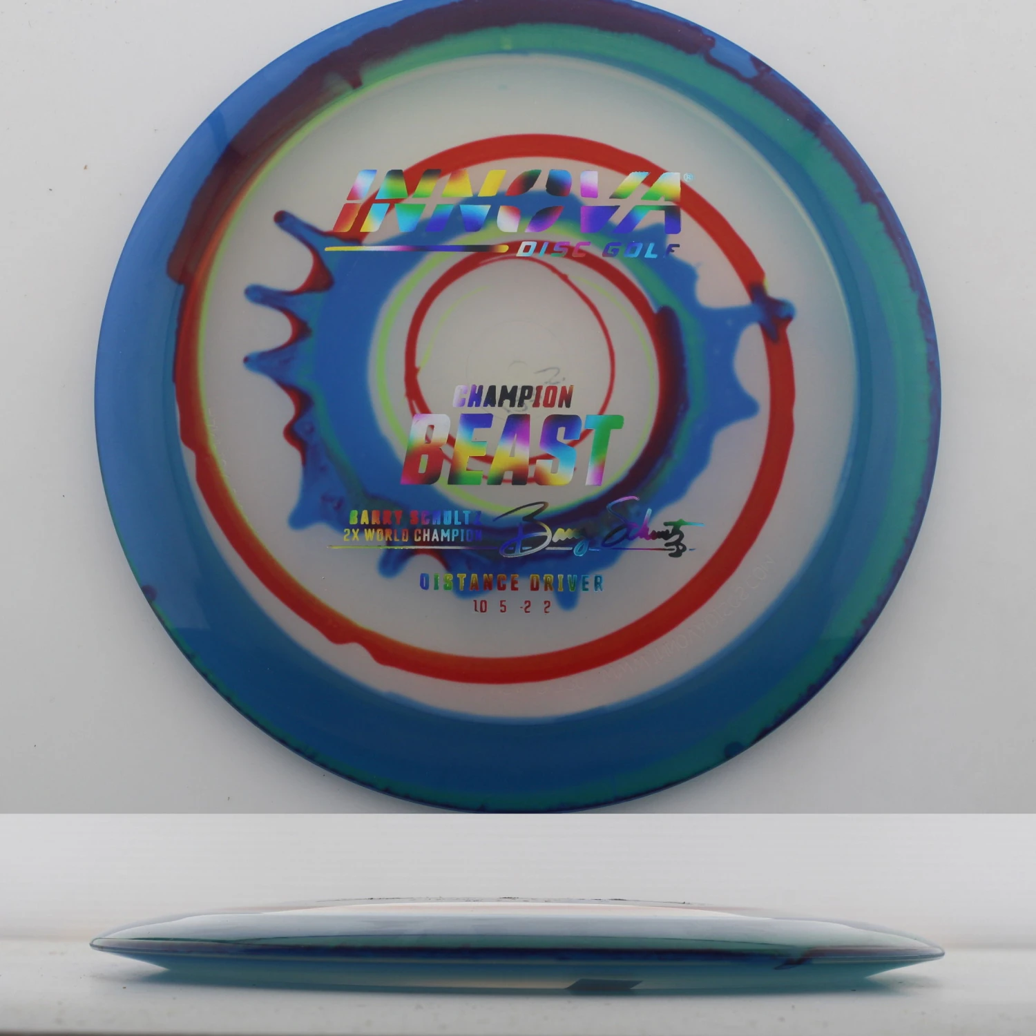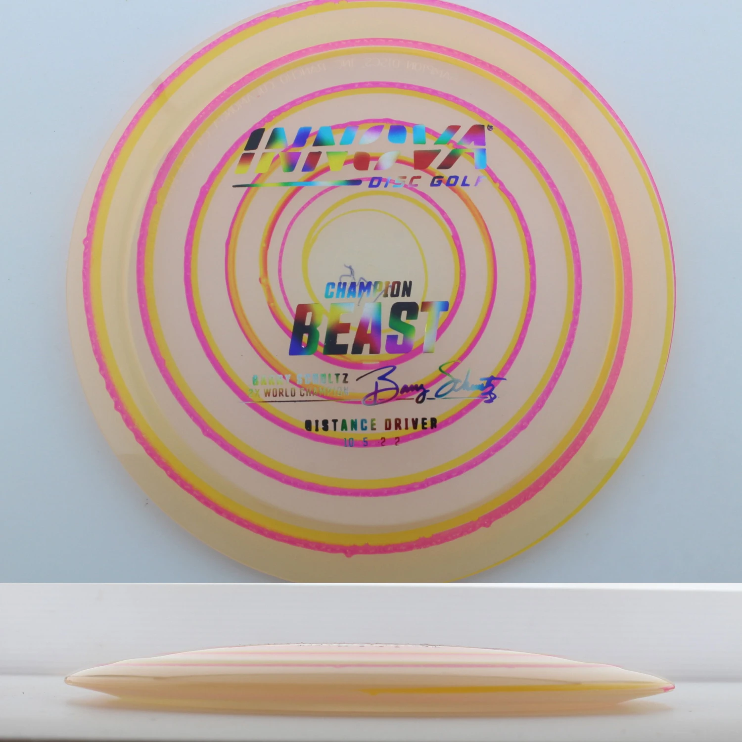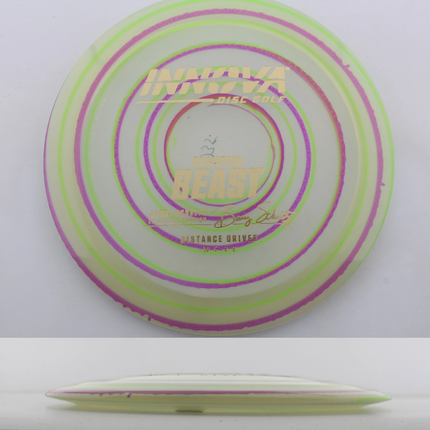 Innova says this about the mold: “The Beast was issued in the era of the wide rimmed driver. It was an instant classic when it was released; giving players more distance using less power. The Beast’s high glide, high speed and high speed turn all combine to give big distance. It is suitable for beginners and pros alike. The Champion Beast is endorsed by two-time World Champion Barry Schultz.”