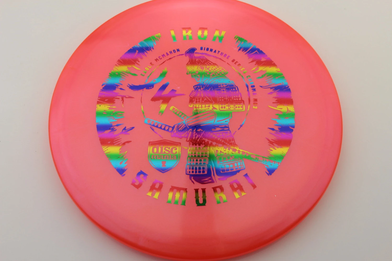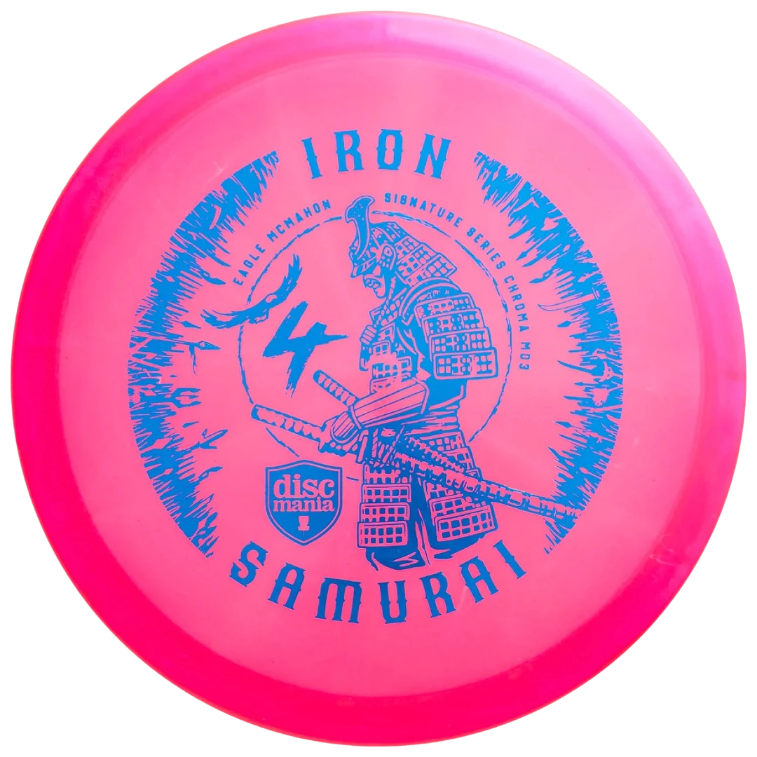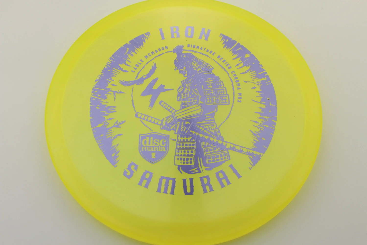 Discmania says this about the mold: “Eagle McMahon Signature Series Iron Samurai 4 is a fantastic all-around midrange that can handle quite a bit of torque. It glides straight with a reliable mellow fade at the end of the flight. The Iron Samurai MD3’s have been Eagle’s go-to midranges for years. Eagle trusts the MD3 for all kinds of midrange shot shapes when it matters the most. The Chroma plastic is extremely durable and catches the eye with its distinct pearlescent look. The Iron Samurai 4 in the Chroma plastic feels firm and grippy in hand to give you the extra bit of confidence when you’re preparing to slice it straight through the narrow fairway. “