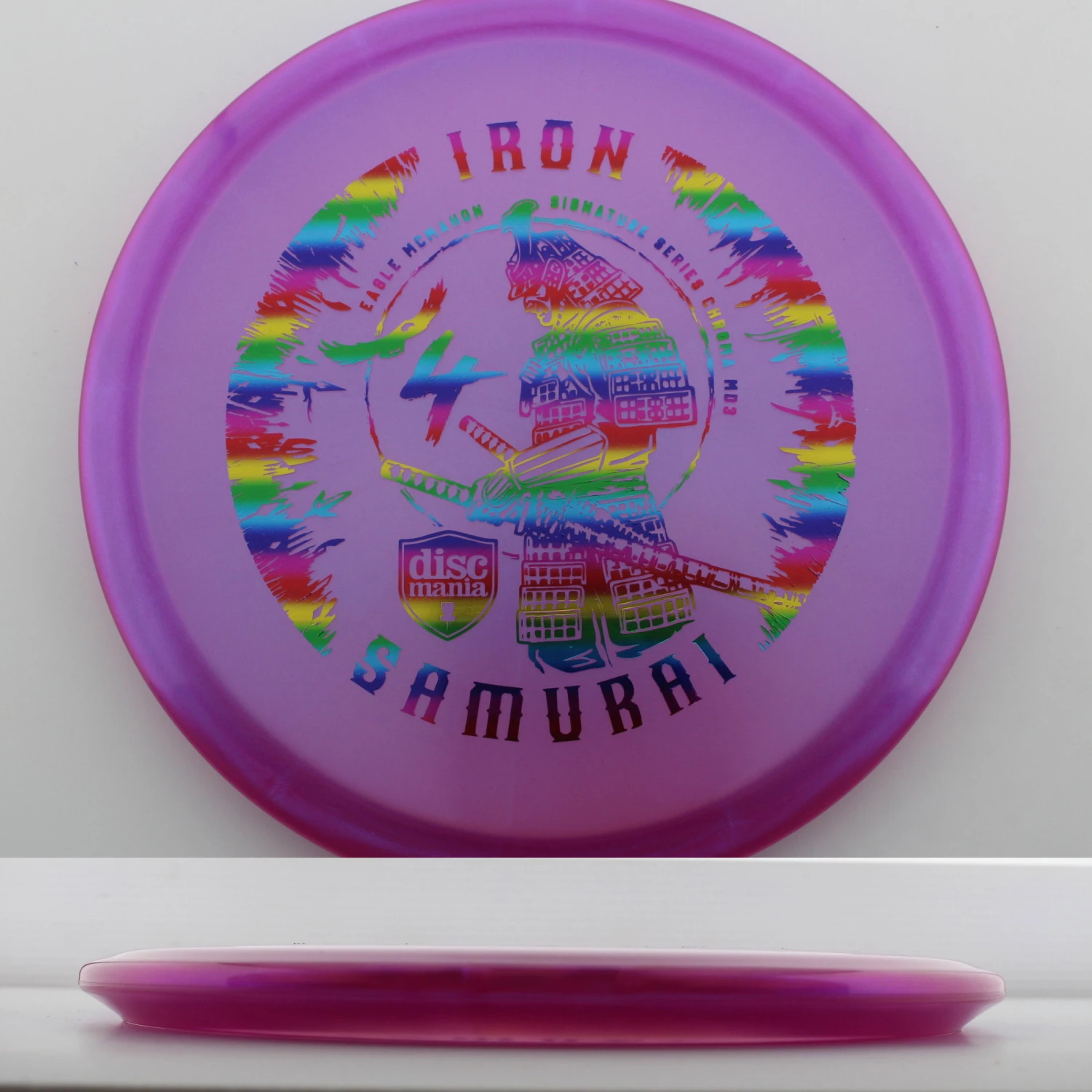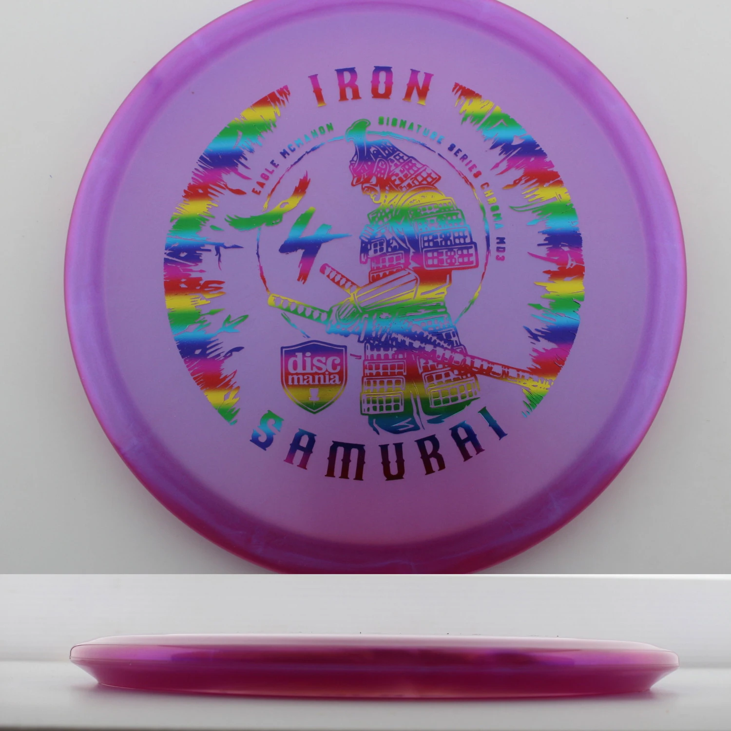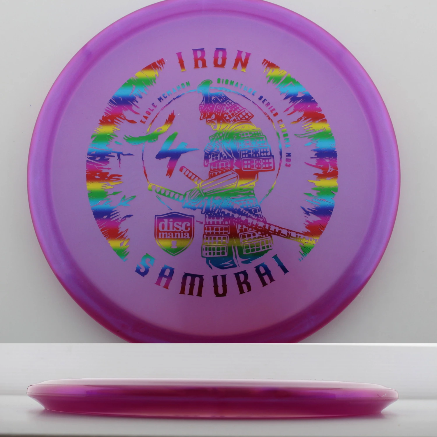 Discmania says this about the mold: “Eagle McMahon Signature Series Iron Samurai 4 is a fantastic all-around midrange that can handle quite a bit of torque. It glides straight with a reliable mellow fade at the end of the flight. The Iron Samurai MD3’s have been Eagle’s go-to midranges for years. Eagle trusts the MD3 for all kinds of midrange shot shapes when it matters the most. The Chroma plastic is extremely durable and catches the eye with its distinct pearlescent look. The Iron Samurai 4 in the Chroma plastic feels firm and grippy in hand to give you the extra bit of confidence when you’re preparing to slice it straight through the narrow fairway. “