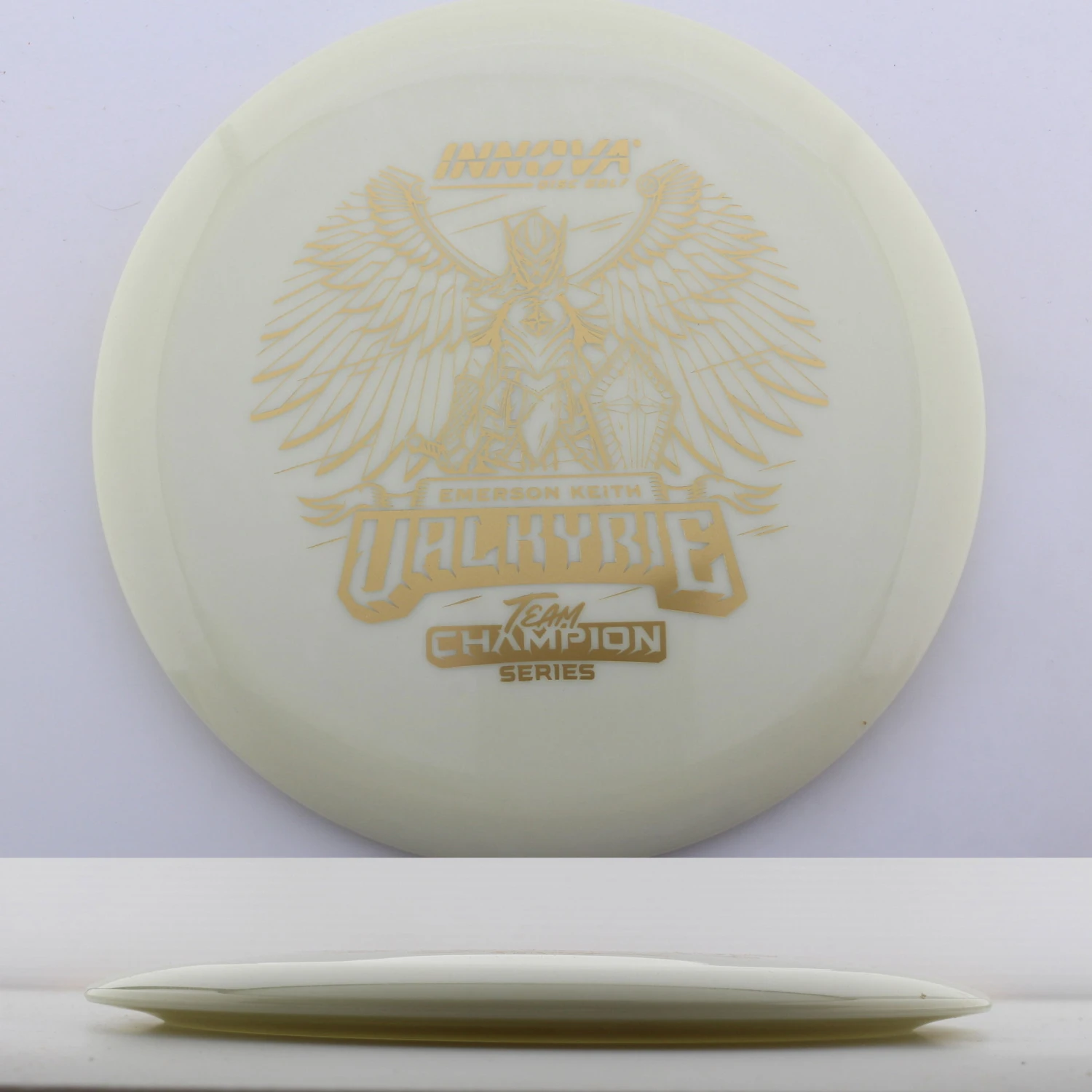 Emerson Keith Proto Glow Star Valkyrie – This is one of the more iconic discs in the Innova lineup. The Valkyrie was one of the 5 original CE production discs and is now featured as the Queen artwork on Innova’s new playing cards. The Valkyrie has a very comfortable grip in the hand and an even better flight. A great disc for beginners to learn on or for more advanced players to shape some incredible shots. Great for rollers, hyzer flips, or nice long turnovers, the Valkyrie is sure to find a spot in your bag if given the chance. Grab a Glow Champion Valkyrie today!