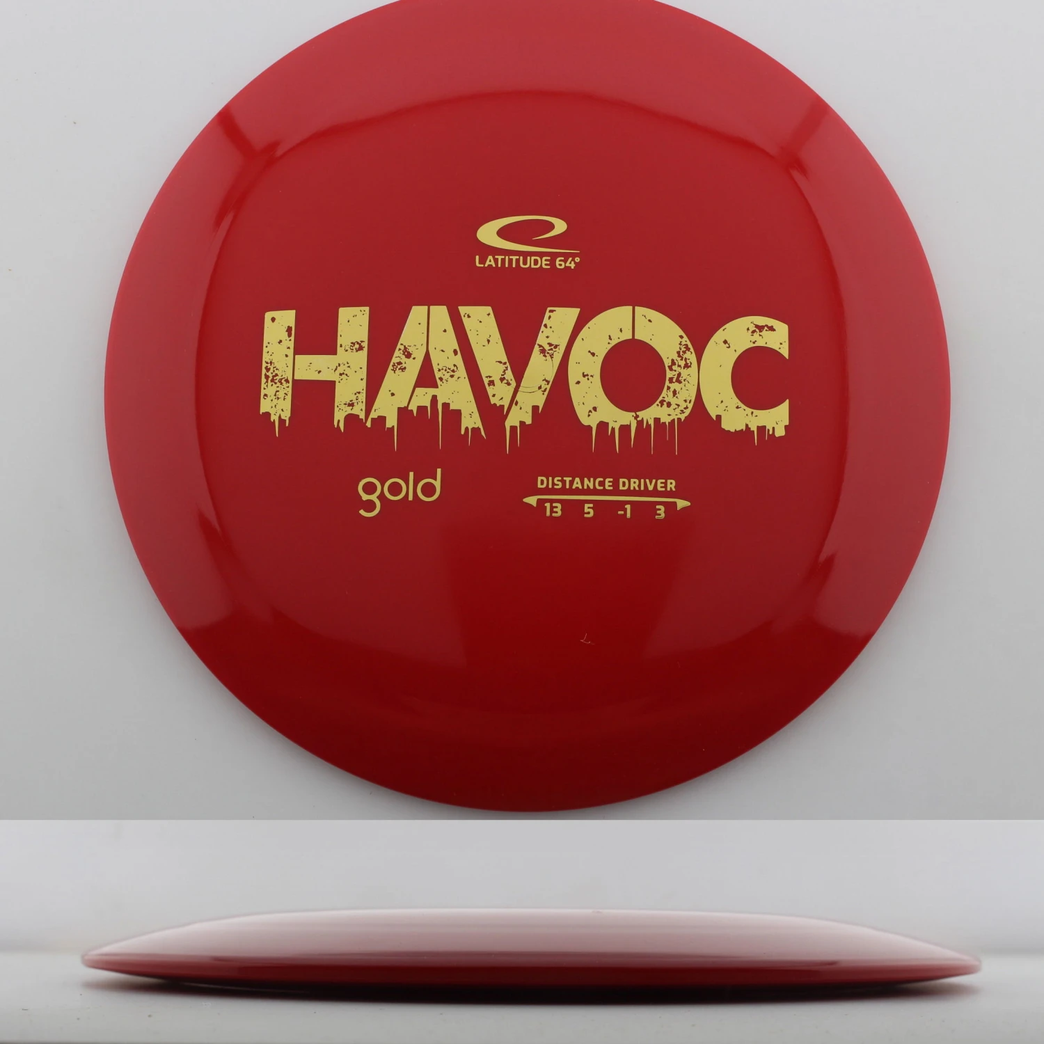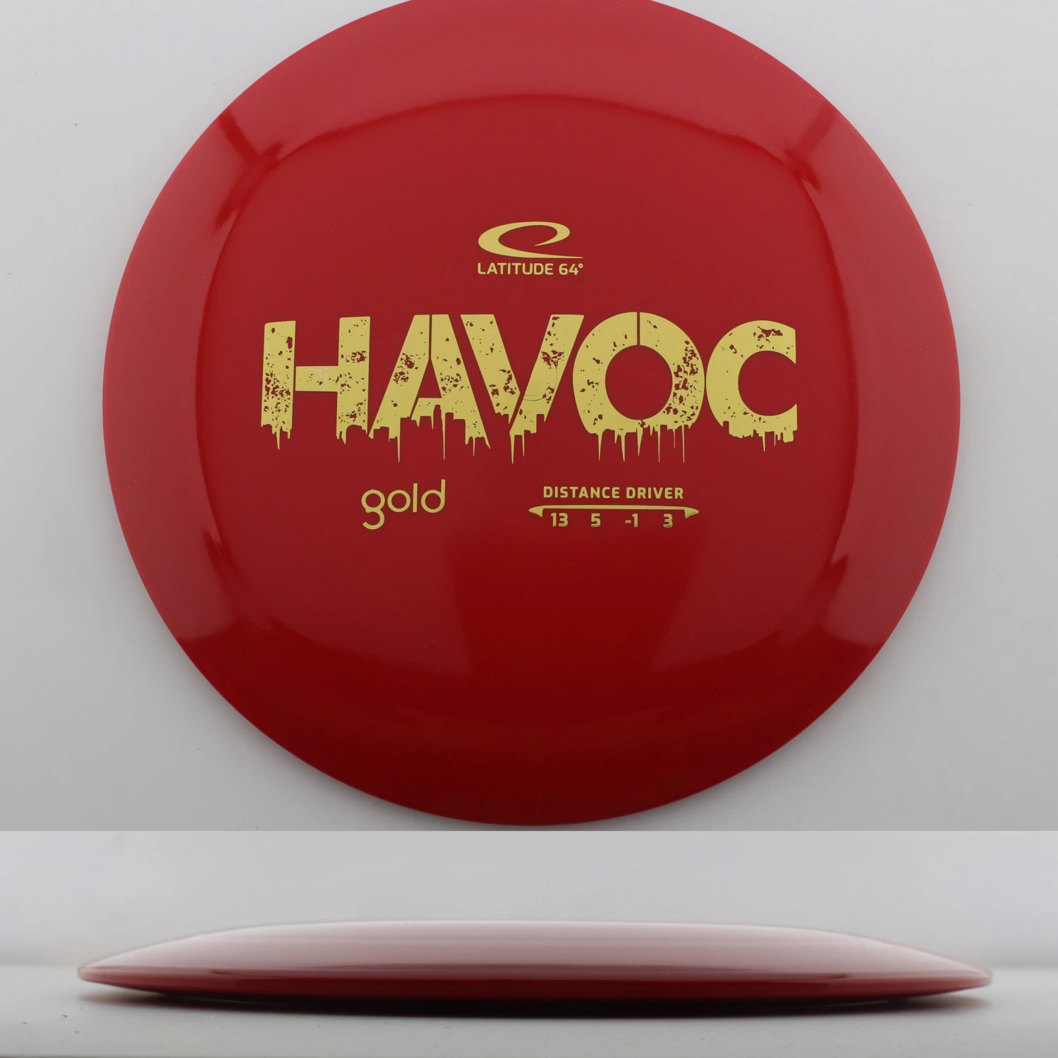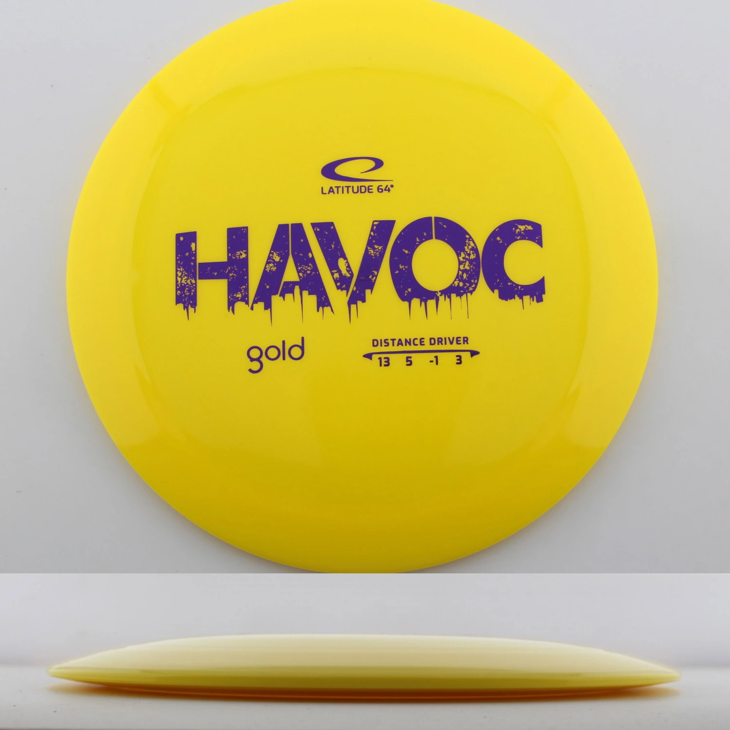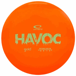 Gold Havoc – One of the more popular distance drivers in the Latitude 64 lineup, the Havoc is fast and has some good flip to it at high speeds. When thrown hard, the Havoc will turn over and glide for a while, with a nice reliable fade at the end. It has a decent amount of low speed stability so you can trust it to fight out if it has enough height. Great for long turnovers or for those with a little less arm speed. A disc you can trust to get max distance when the hole calls for it. The Gold Line plastic has an amazing feel with plenty of grip without sacrificing durability or performance. If you want a long distance, slightly understable distance driver then try out a Latitude 64 Gold Havoc.