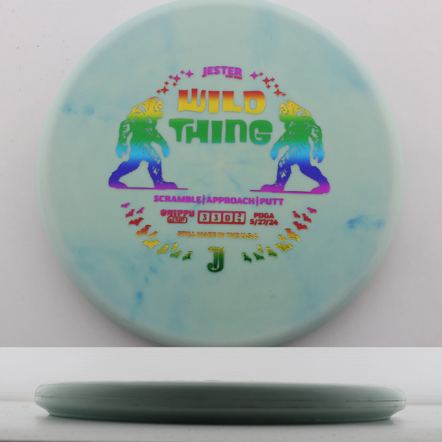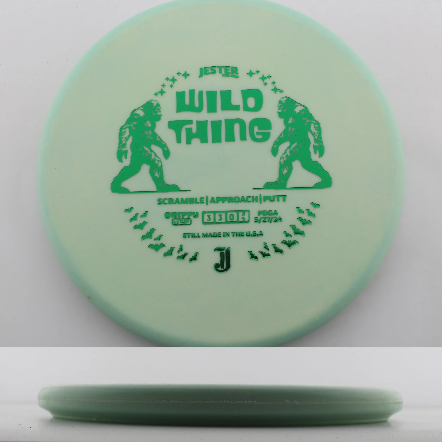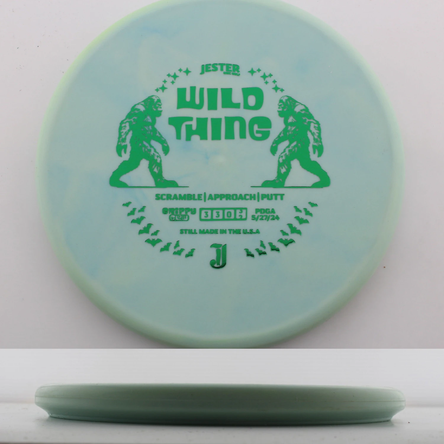 Jester Discs says this about the mold: “Everything Wild Thing. You could even say it glows! Nuanced WT stamp hints at things of the night, helping you find this workhorse during the darkest of night rounds. Blunt-faced and beaded, this overstable disc will turn and drop in on its target. These discs are flat, and the Grippy Formula is just that. Some prefer this disc’s wind-fighting ability when putting as well. More stable than the LOVE, Wild Thing has significantly less glide than its popular predecessor.”