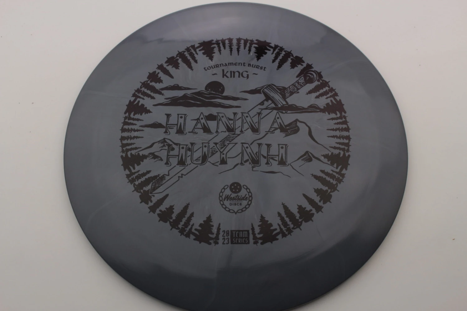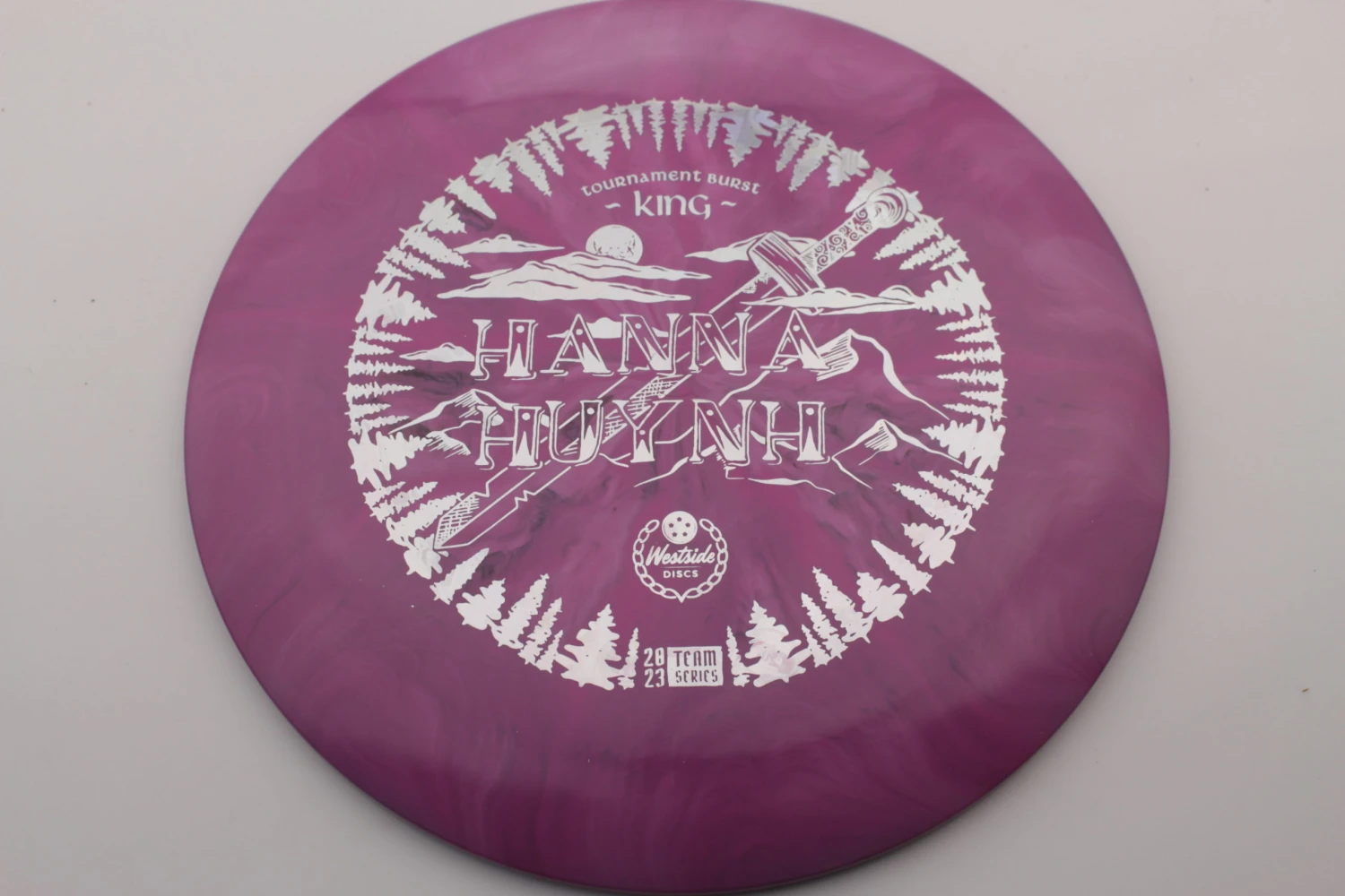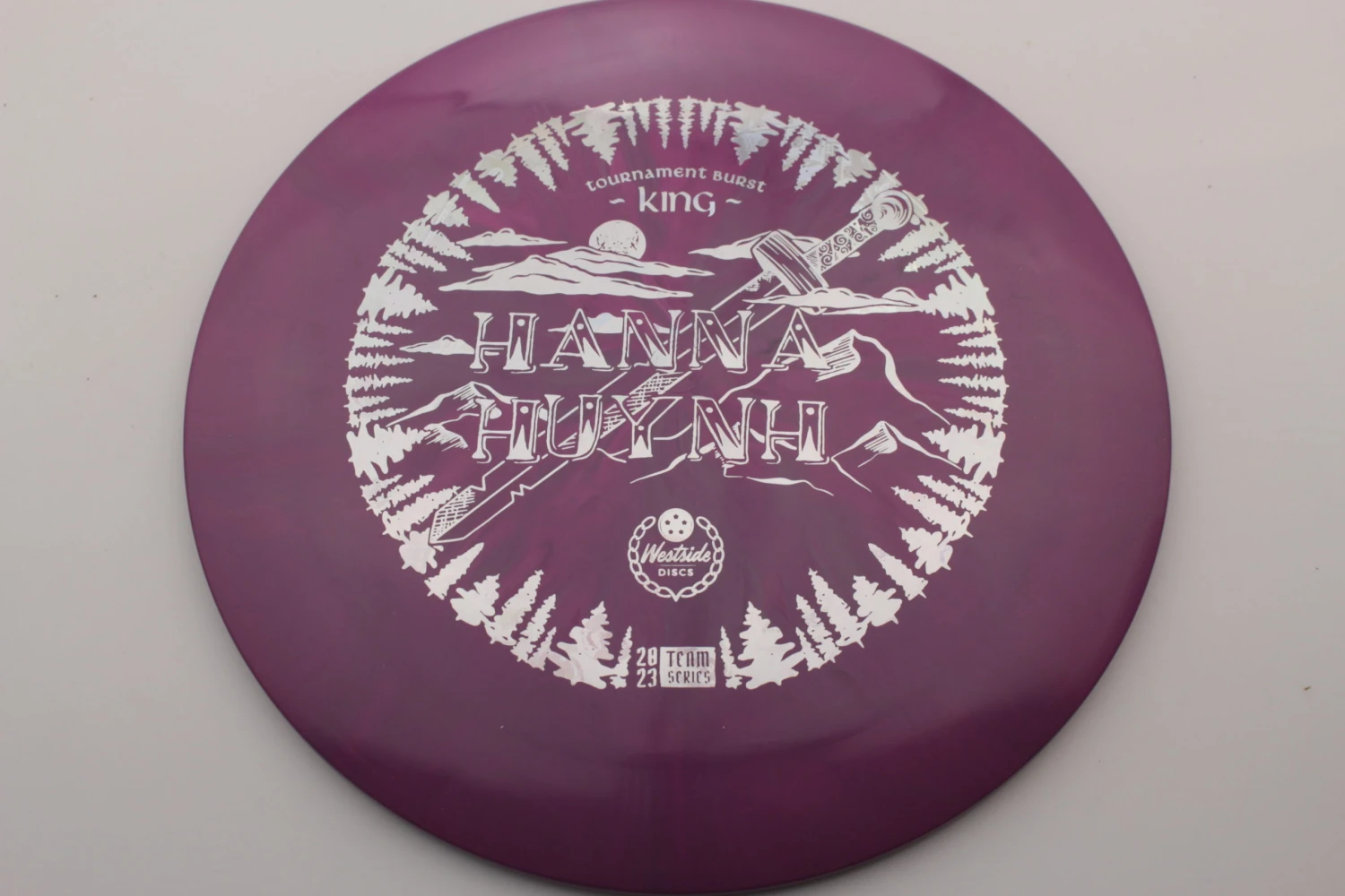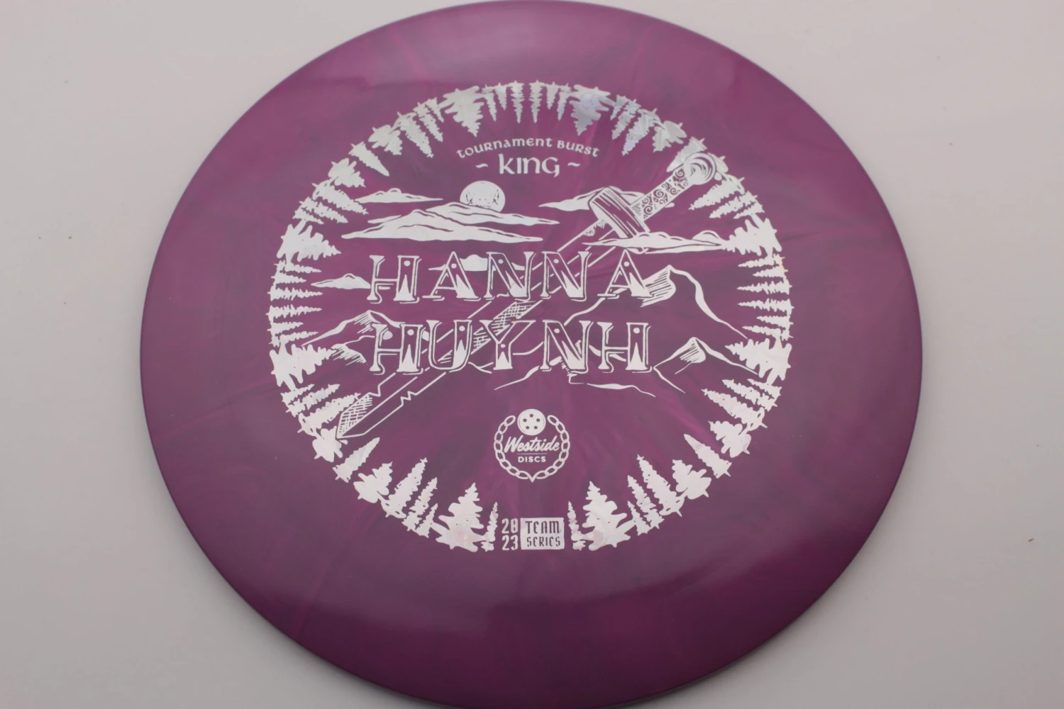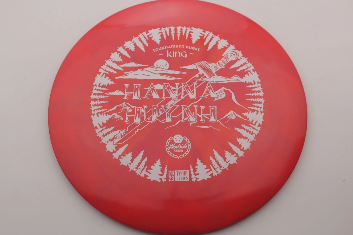 Hanna Huynh Tournament Burst King – One of the faster discs in the Westside lineup, the King has some good turn with a very reliable fade. A nice tapered rim gives this a comfortable feel in the hand. For the top arm speeds, the King will definitely get some flip up with a ton of glide to get that max distance. In the Tournament plastic it is a disc that will have some stability and durability while maintaining a nice grip to it. Make sure you grab a Westside Discs Hanna Huynh Tournament Burst King today!