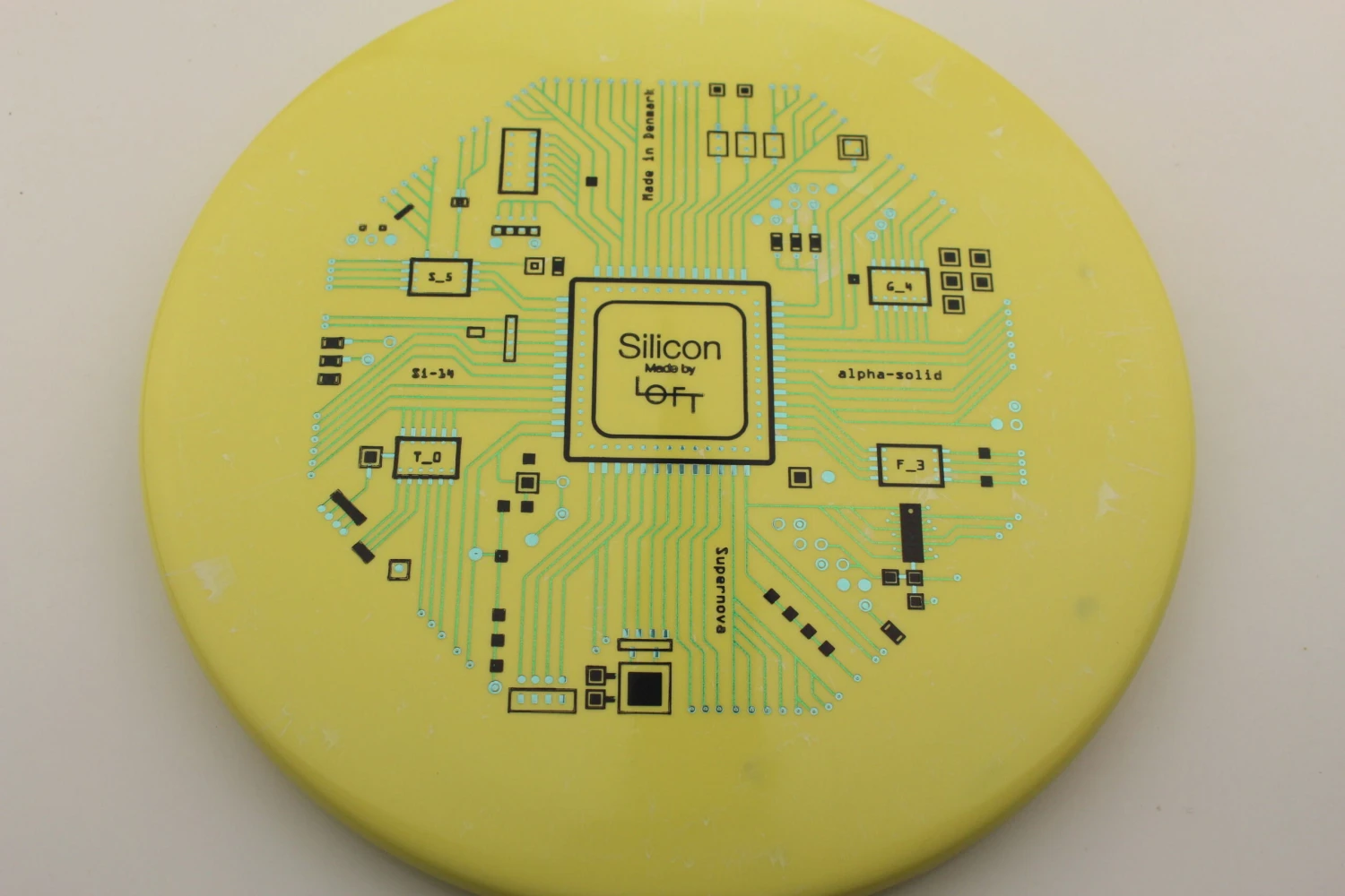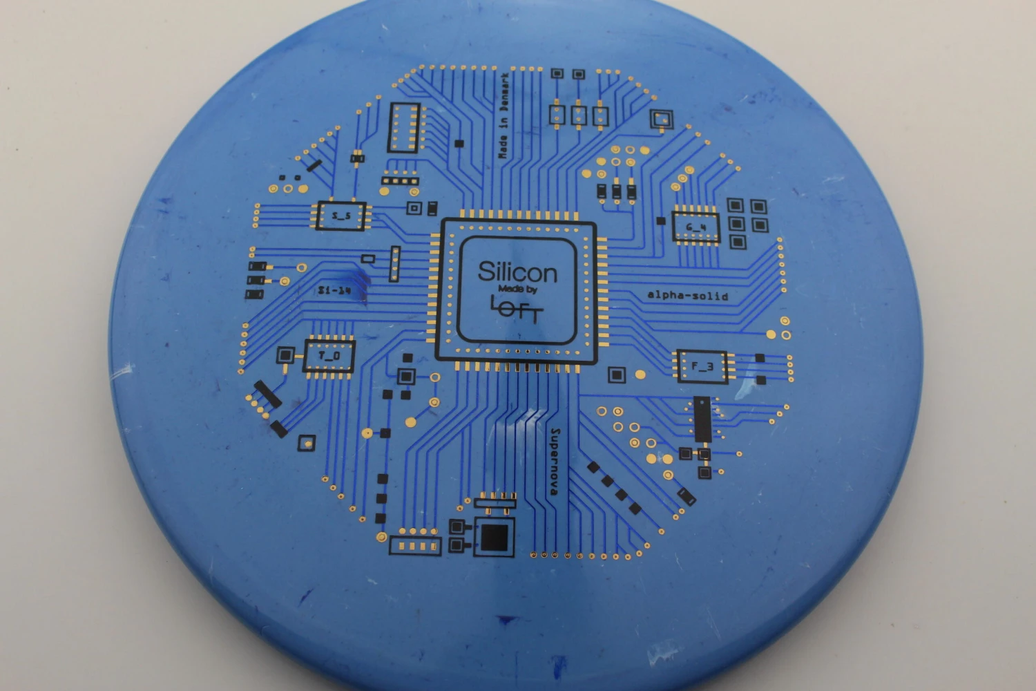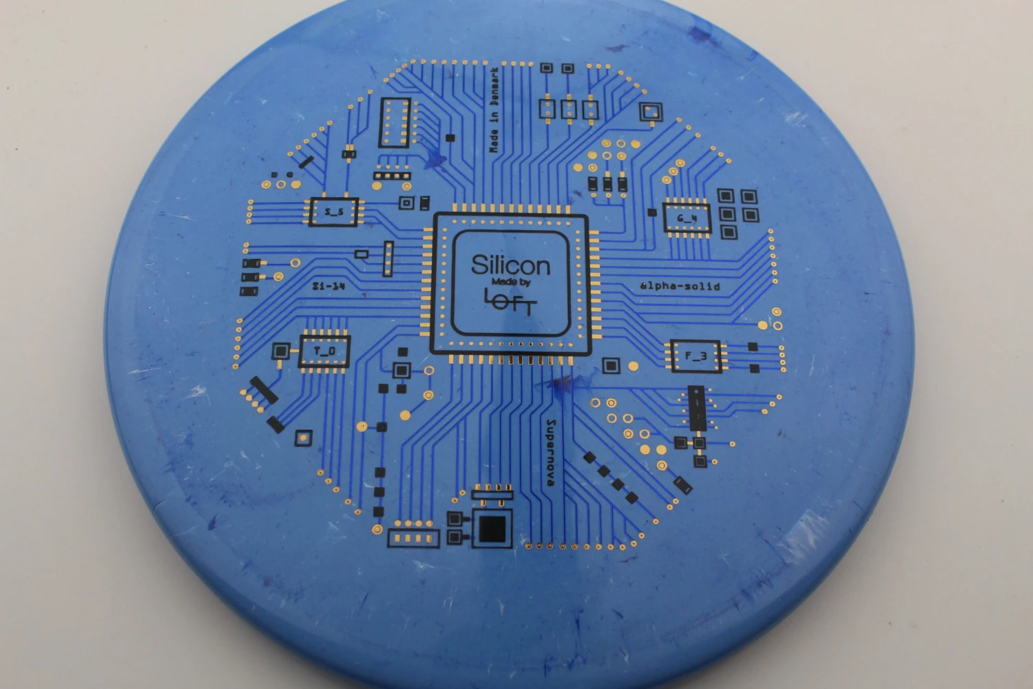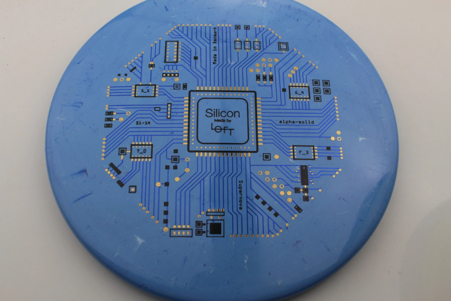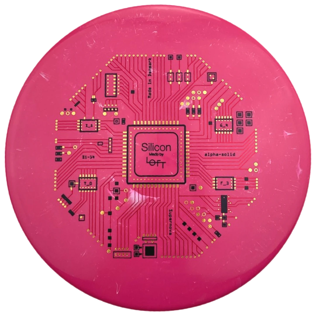 Loft Discs says this about the mold: “This is our α-Solid Supernova Series with triple foil multi-color stamp. This is the first time we have made triple stamps, and we really love how it turned out. Løft co-founder Asger Sandahl has really put a lot of effort into designing this stamp. The design is inspired by the layout of integrated circuit computer chips which are made on a plate of Silicon, and Asger has put every little detail together one at a time piece by piece to create this. The result is even more visually pleasing than we imagined it would be, and it really comes to life on the Alpha-solid Supernova plastic. We like that the theme corresponds well to our overall vision of bringing the scientific method in as part of our disc design process. We hope you like it as well. Can you spot the flight numbers?”