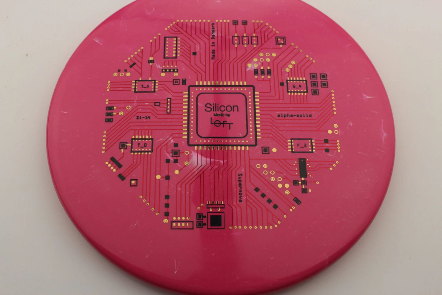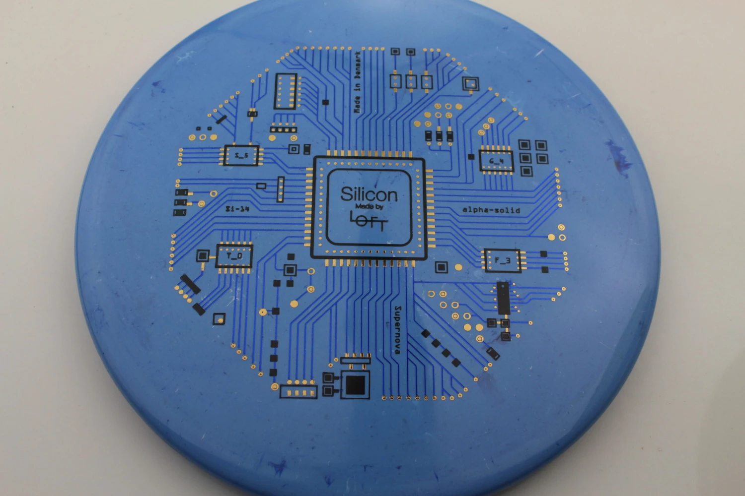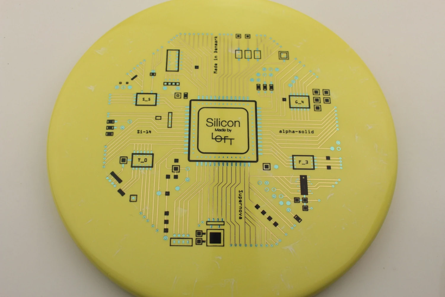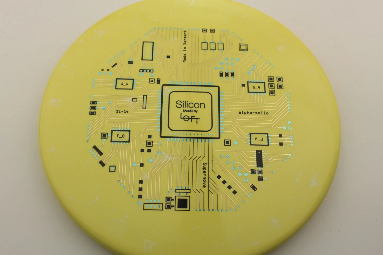 Loft Discs says this about the mold: “This is our α-Solid Supernova Series with triple foil multi-color stamp. This is the first time we have made triple stamps, and we really love how it turned out. Løft co-founder Asger Sandahl has really put a lot of effort into designing this stamp. The design is inspired by the layout of integrated circuit computer chips which are made on a plate of Silicon, and Asger has put every little detail together one at a time piece by piece to create this. The result is even more visually pleasing than we imagined it would be, and it really comes to life on the Alpha-solid Supernova plastic. We like that the theme corresponds well to our overall vision of bringing the scientific method in as part of our disc design process. We hope you like it as well. Can you spot the flight numbers?”