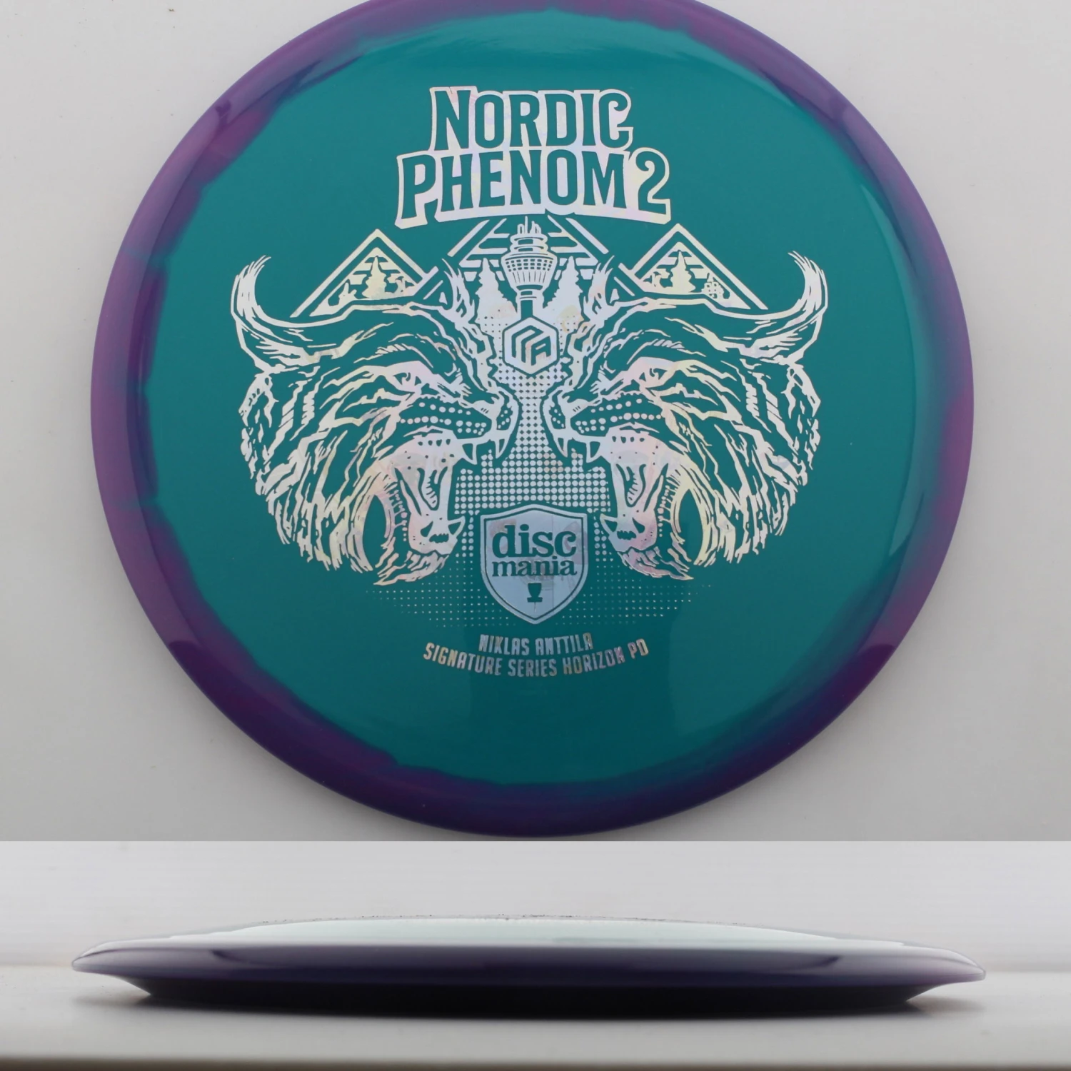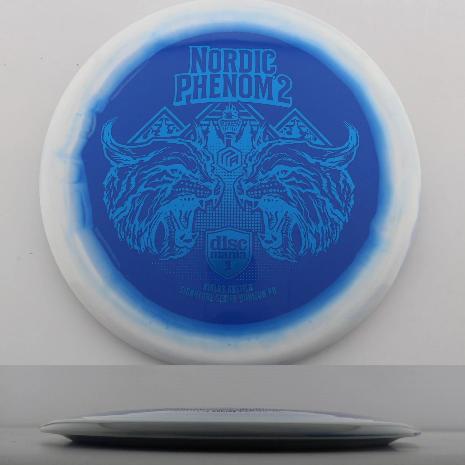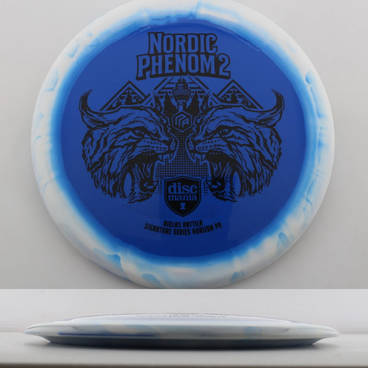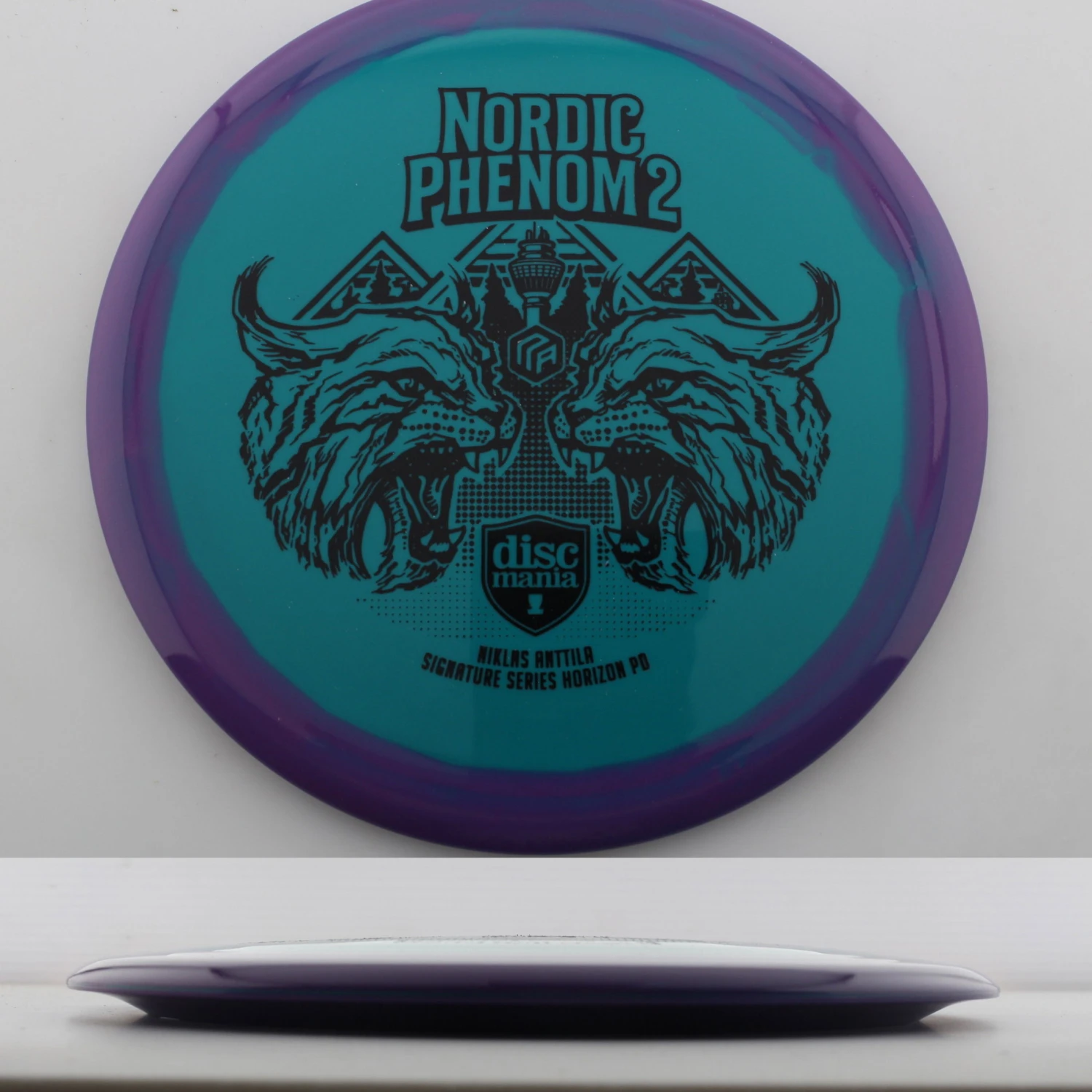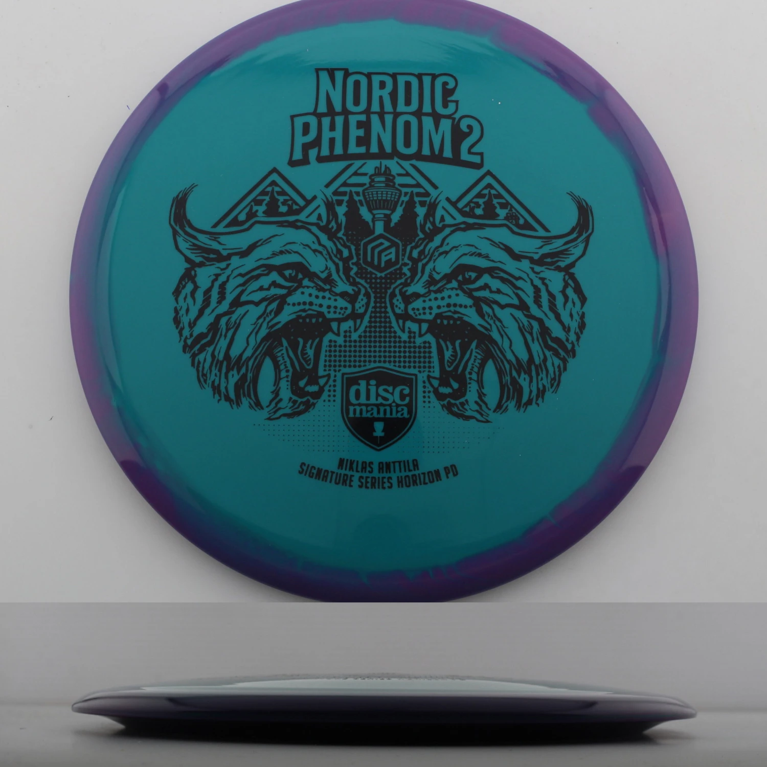 Discmania says this about the mold: “The Phenom strikes for a second time with Niklas Anttila’s second version of his famous PD, the Nordic Phenom 2. We’ve adjusted the flight of the disc just a bit to give it a slightly straighter flight path with the slightly more domey profile and excellent glide PD lovers enjoy most. We’ve thoughtfully executed another nod to Niklas’ Finnish roots with another rendition of his famous fateful Lynx design. The Puijo tower, the landmark of Nikke’s hometown that sits on top of a world-famed ski jumping hill, is featured in the artwork as well.”