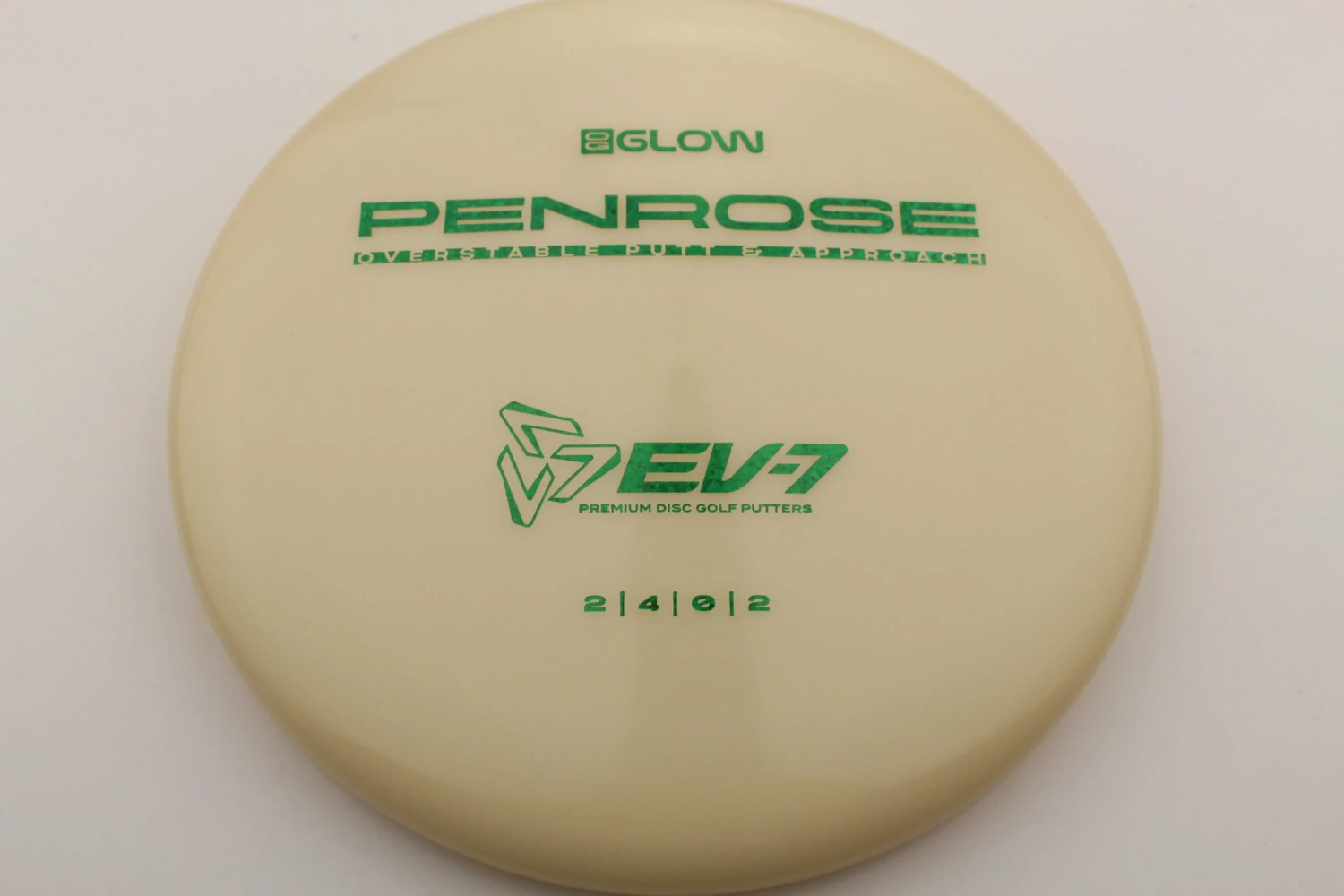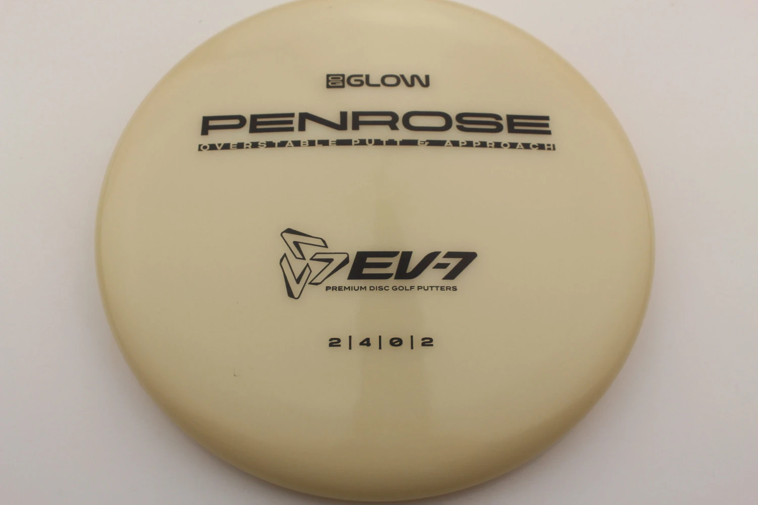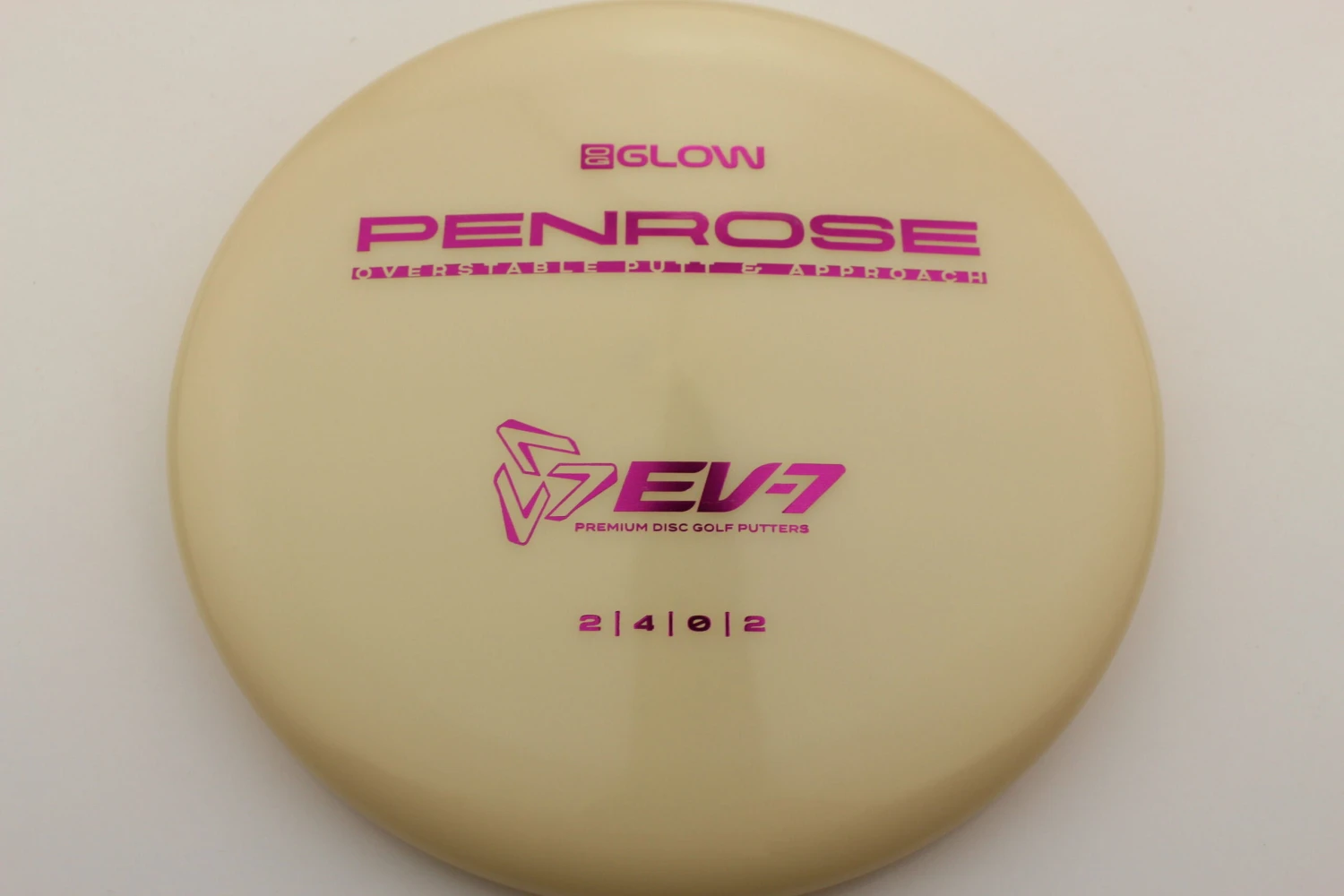 EV-7 has this to say about their debut disc: “EV-7’s flagship putter, the Penrose, is now available in a limited, prototype glow plastic, OG Glow. OG Glow is similar to our OG Medium plastic in flex, but with a slightly smoother texture. The Penrose has reliable high-speed over stability and resistance to turn, but is uniquely straight with consistent fade at lower speeds on the putting green. With a slightly deeper profile, small bead, and smooth feel, the Penrose fits the hand comfortably, inspiring confidence for both putts and upshots.”