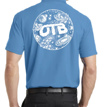 OTB Space Polo – This is Version 2 of our OTB Space polo with an updated front logo and a new shirt. Due to supply chain issues we had to switch up our shirts. These are still a polyester shirt but they have almost a waffle pattern that makes it feel cottony. The front logo is one of the space ships pulled from the big space logo. This design is a classic and you will love it.