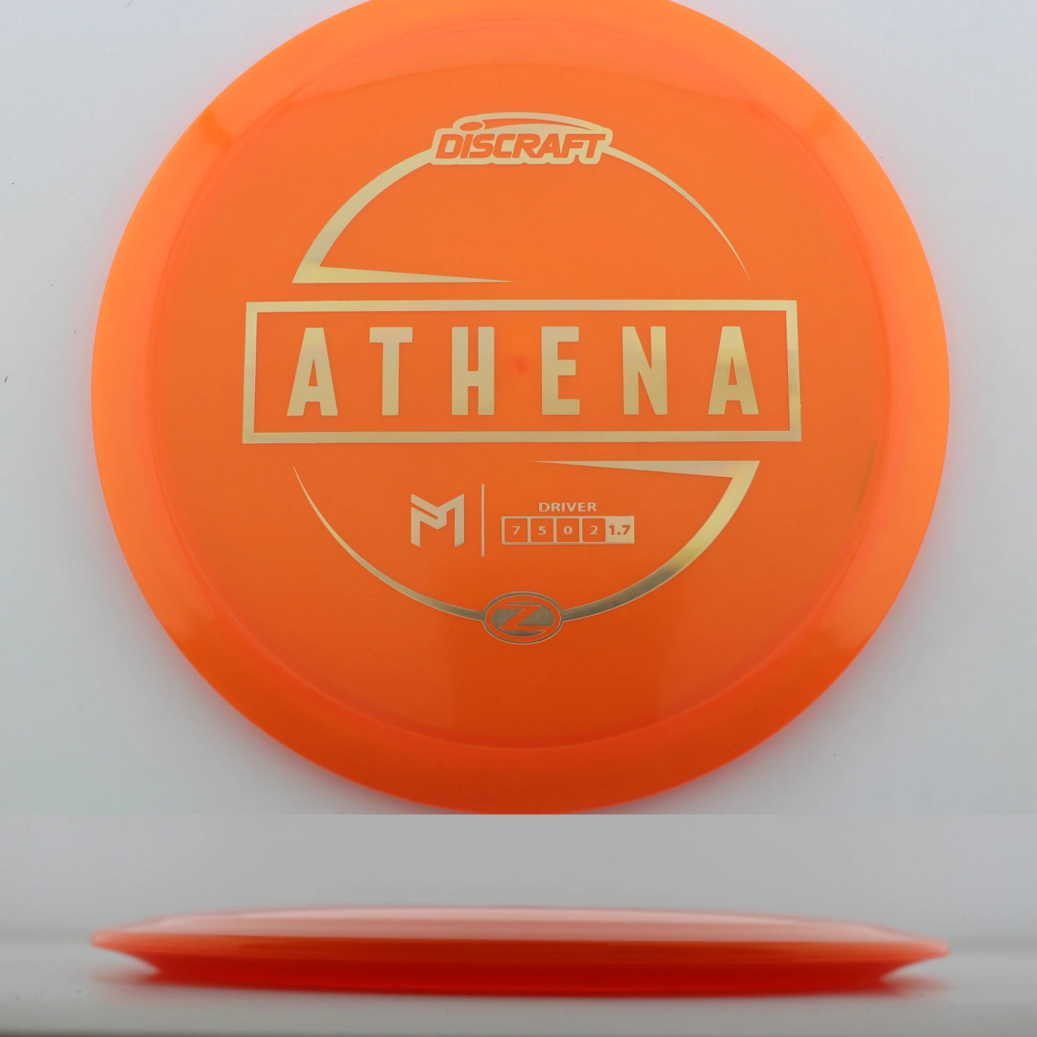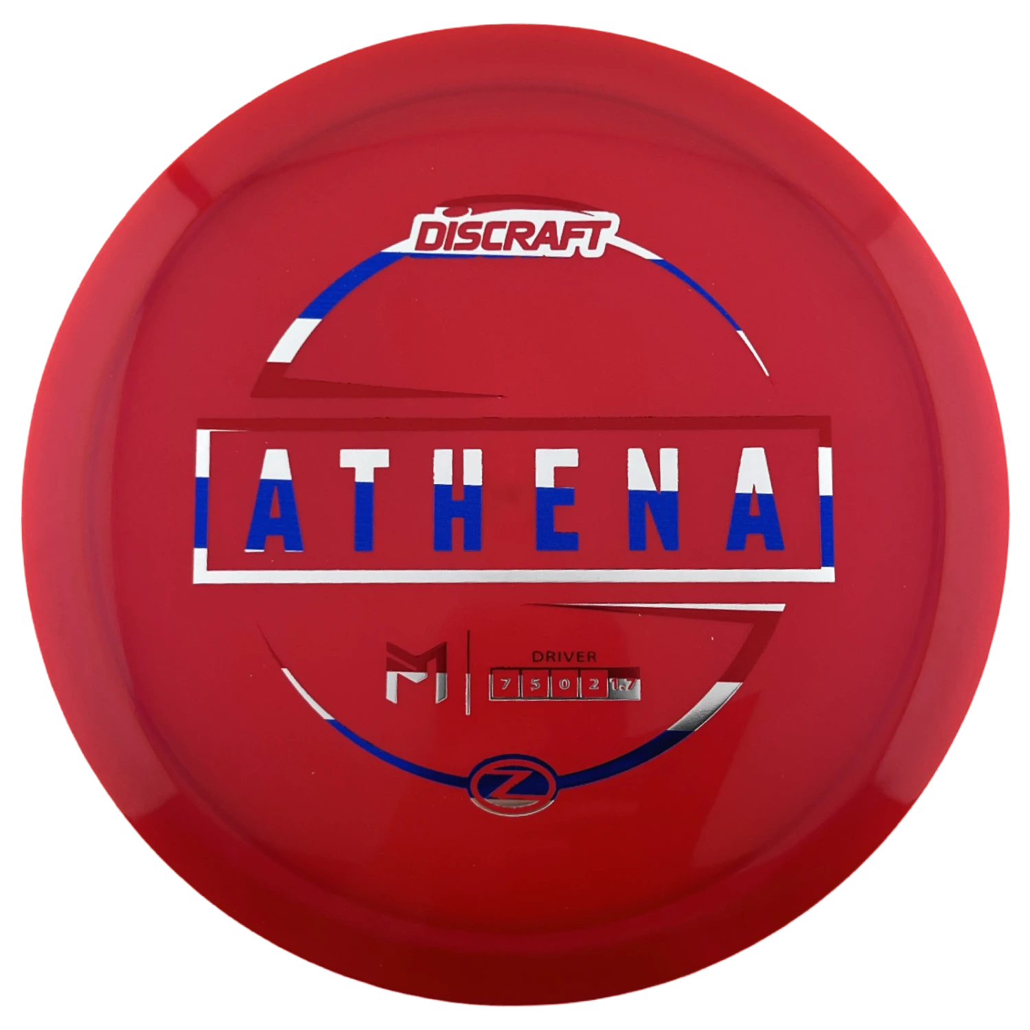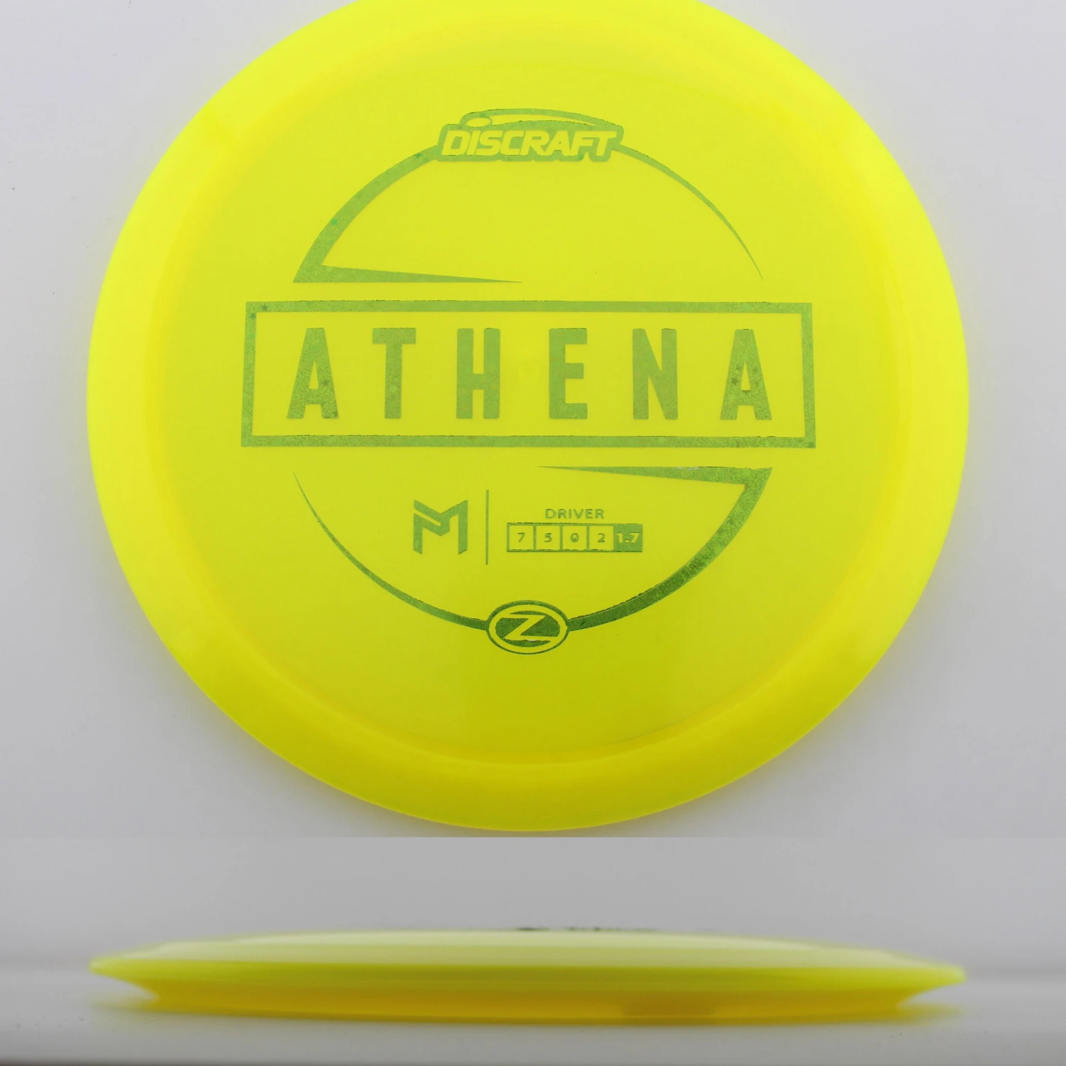 Discraft says this about the mold: “The Discraft Athena is a straight to stable fairway driver and is the 6th disc in Paul McBeth’s signature lineup. The Athena has been described by McBeth as a slower Anax. The Athena has a consistent flight path, making this a very controllable fairway driver. These Athenas were ran in Z Lite plastic for the first time, increasing glide and ensuring effortless distance.”