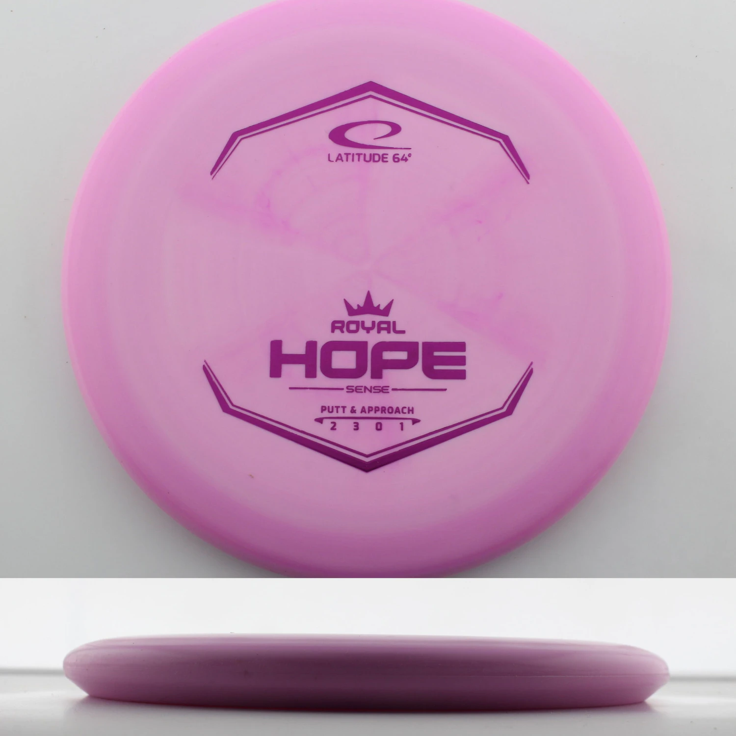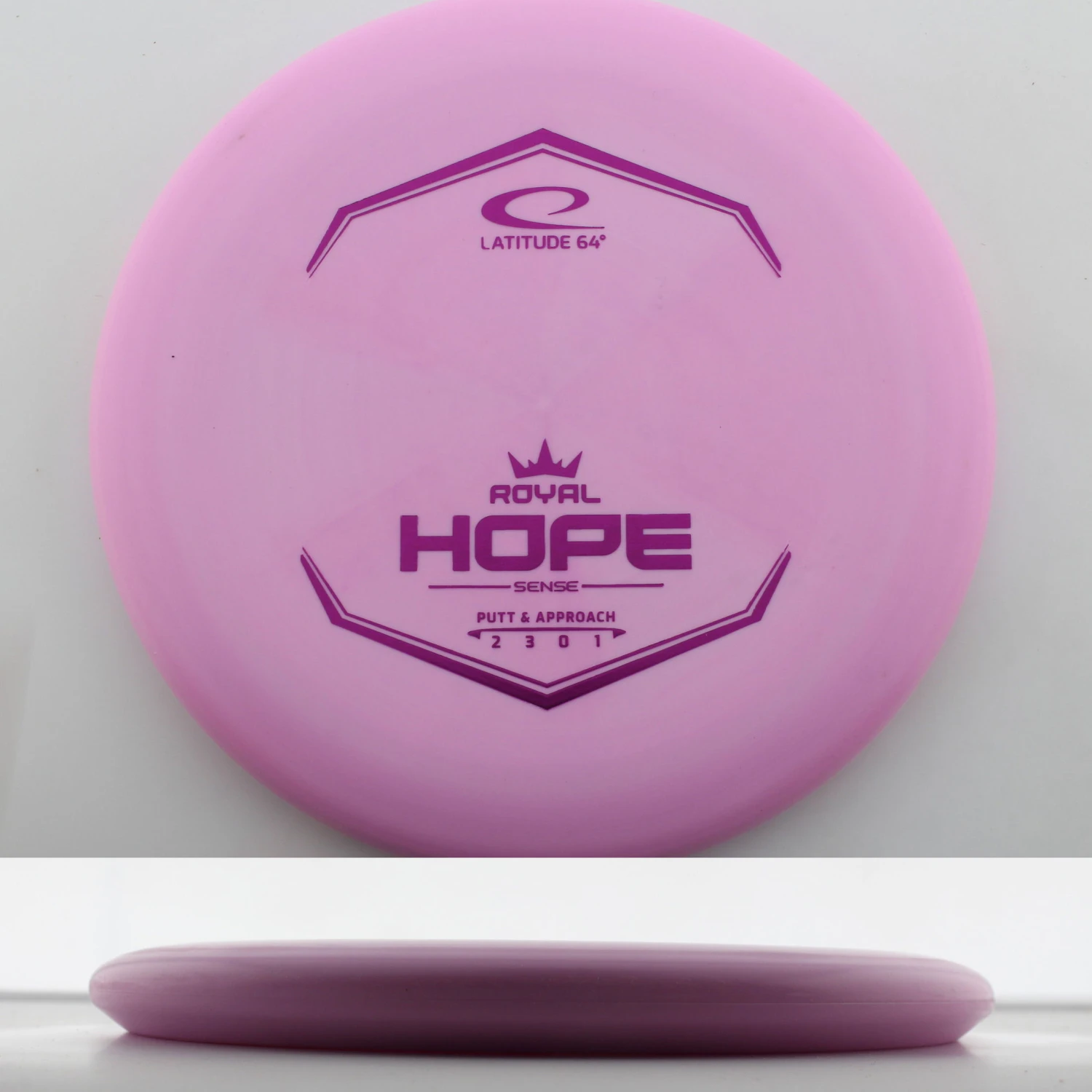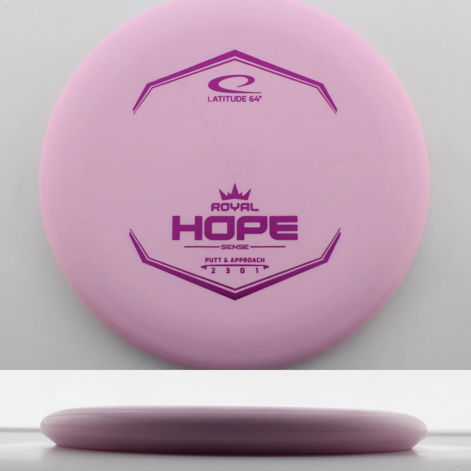 Royal Sense Hope – The Hope is a great feeling disc that is beadless and has an amazing straight flight in the circle and on the approaches. The Royal Sense plastic has a great feel to it and is perfect for putting in the circle. Latitude 64’s Royal line uses NexEdge and NexFeel technology to make a buttery smooth feel in the hand. Grab a Royal Sense Hope today!