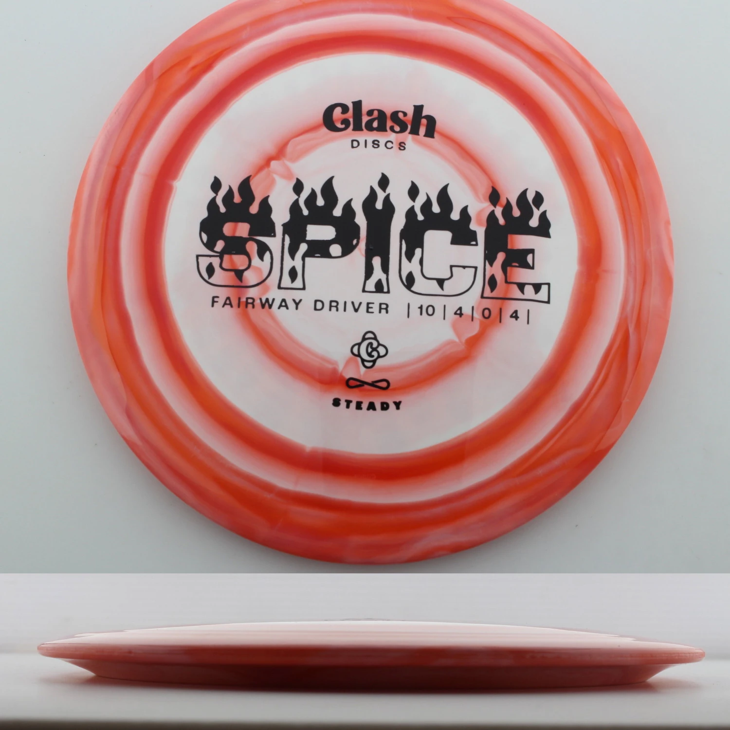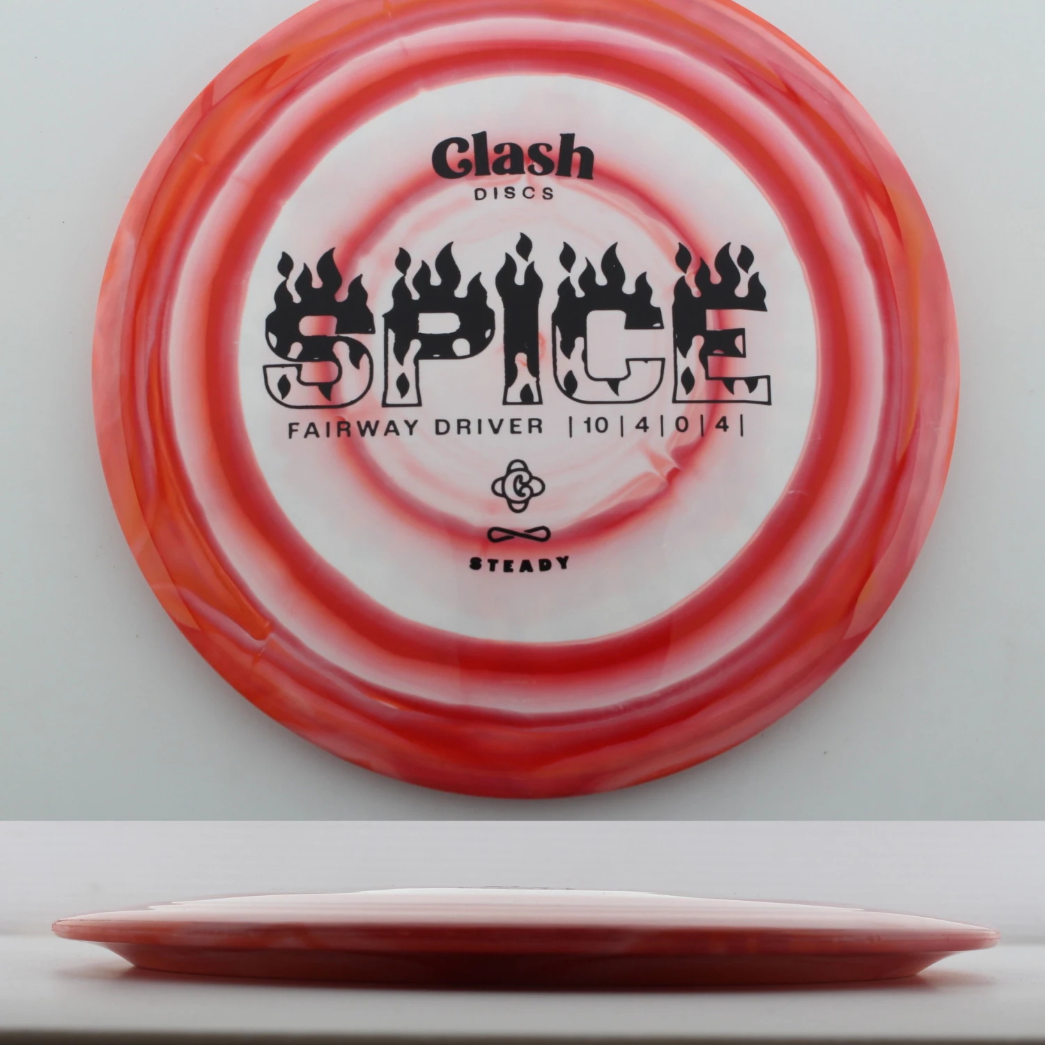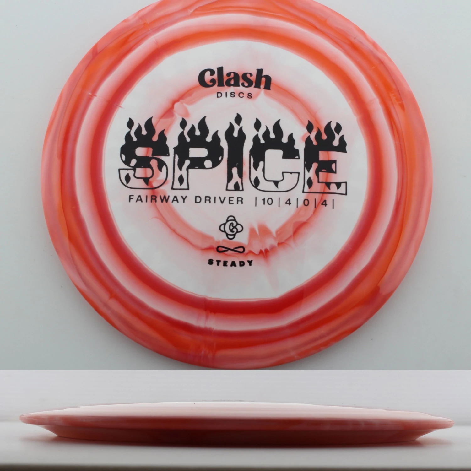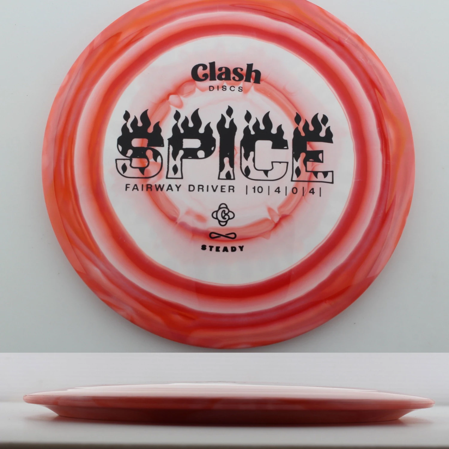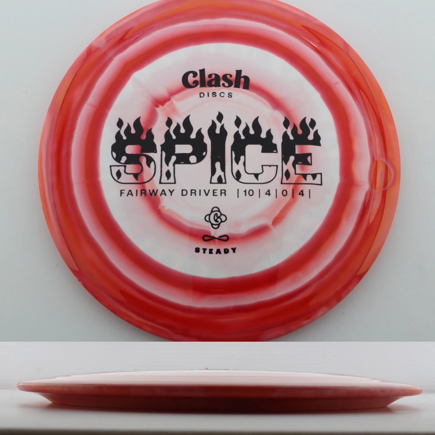 Swirl Steady Spice – Eric Oakley is known for powering forehand fairway shots on beautiful flexing shots. The ideal disc to do this is a flat, 9 or 10 speed that has tons of stability. Clash and Eric Oakley got together to design this great feeling mold that has all the over stability you need to crush on power forehands or backhand hyzers. The Swirl Steady plastic has a great feel in the hand and will hold up well over time. Make sure you grab a Clash Discs Steady Spice today!