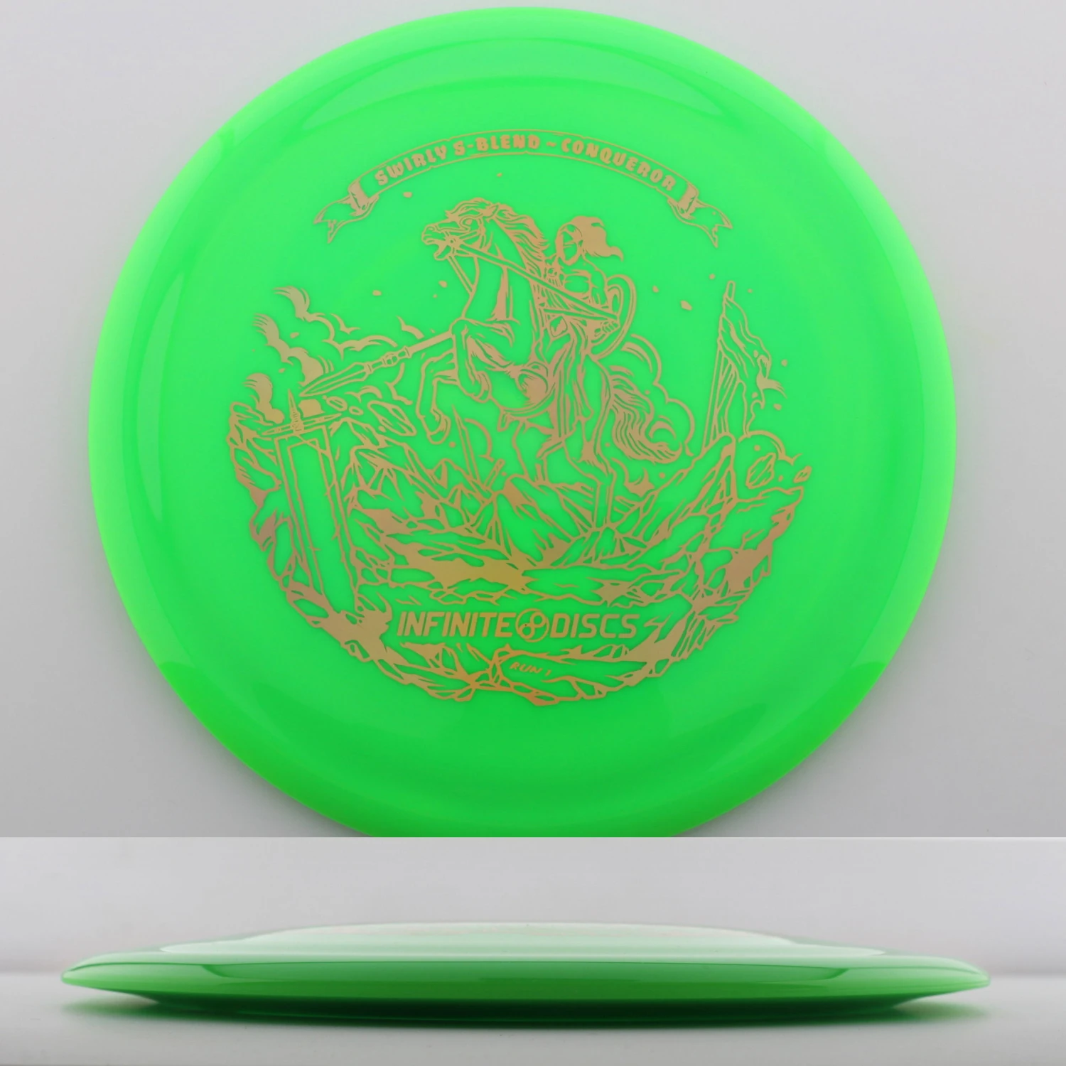 Infinite Discs says this about the mold: “The Conqueror by Infinite Discs is a formidable overstable distance driver designed to conquer the challenges of the most powerful throws, even in the hands of professional players. When unleashed, the Conqueror showcases an impressive end-of-flight fade, whether launched forehand or backhand, and dependably conquers fierce headwinds with unwavering stability.”