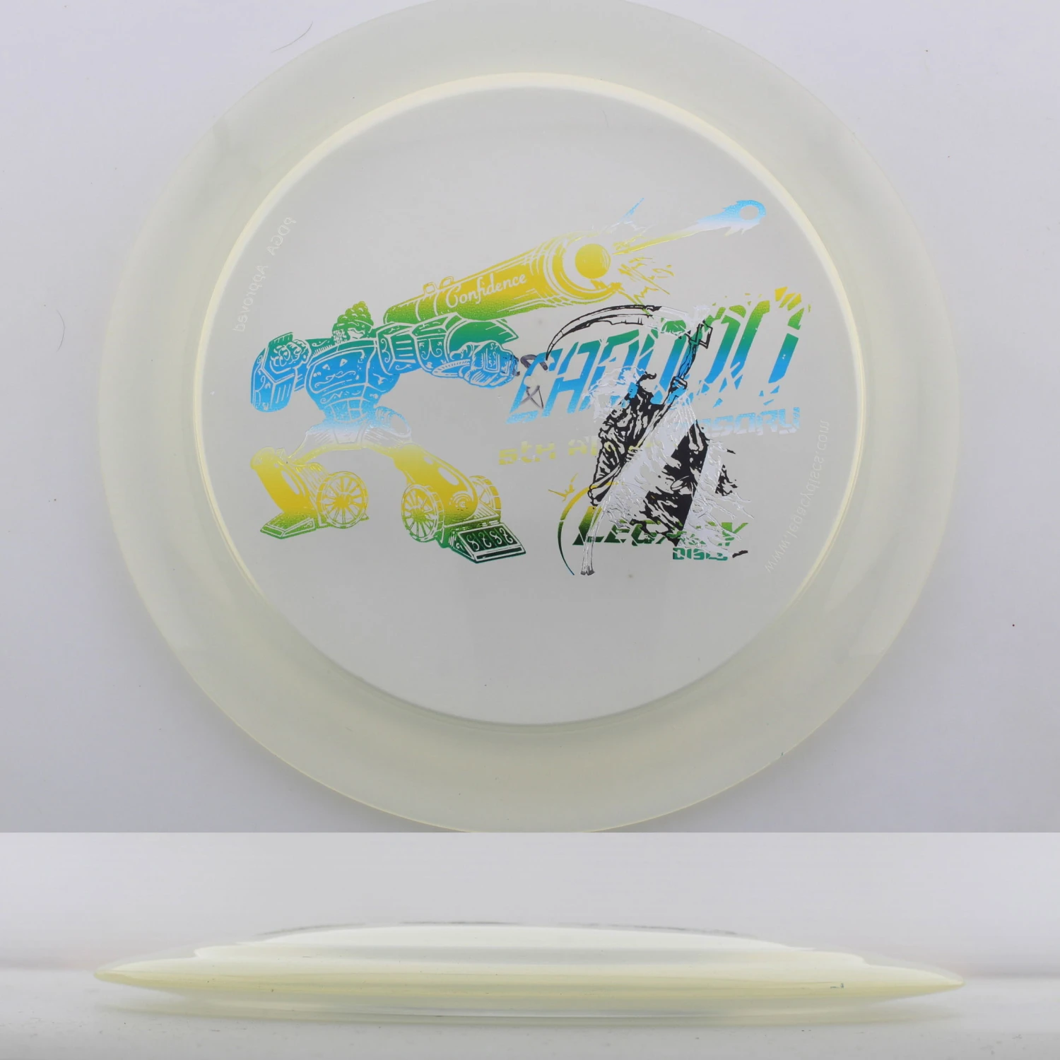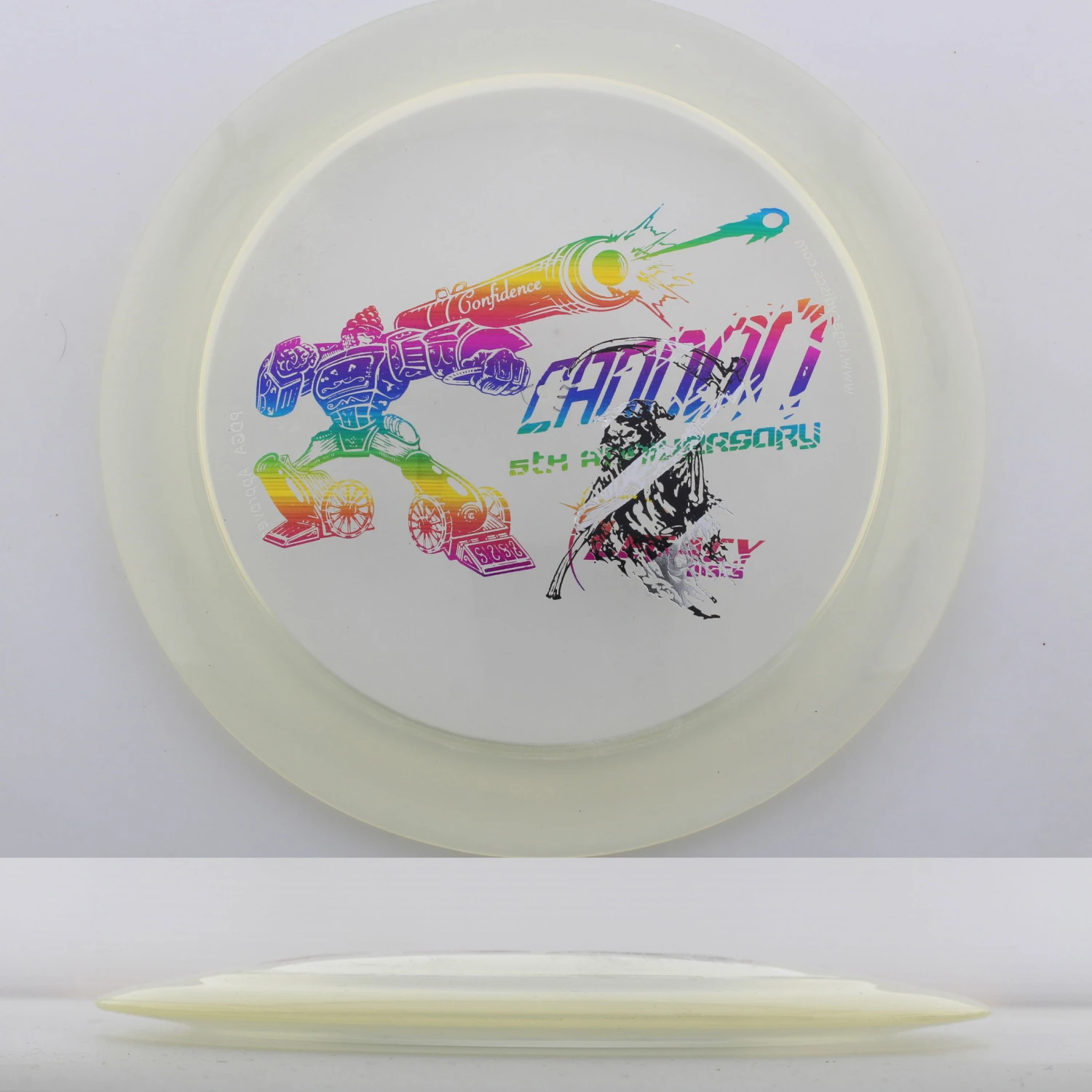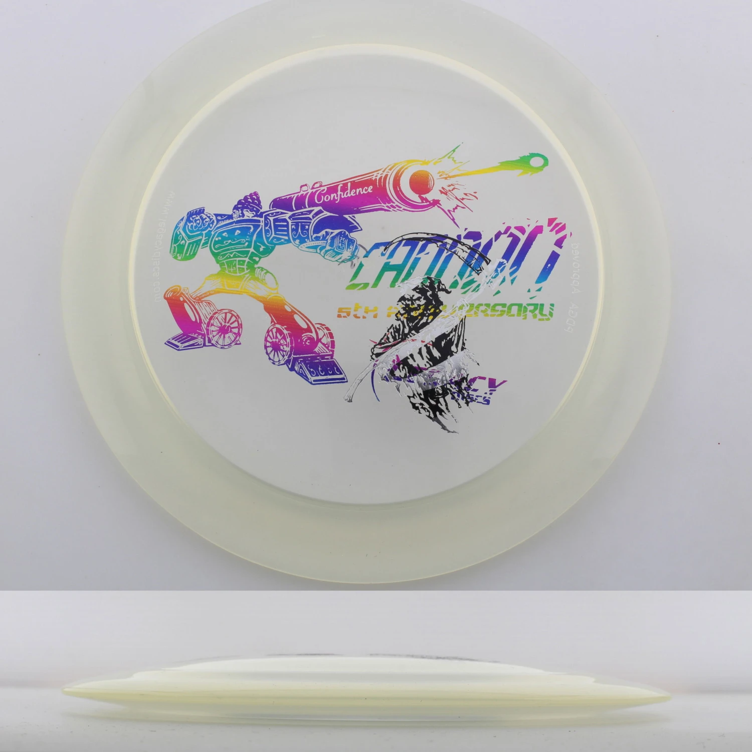 X-Out 5th Anniversary Cannon – A special run made to celebrate the 5th Anniversary of the Cannon. The plastic for this run was quite unique. Most of them came out very clear/un-pigmented in color, domey, and quite flexible/gummy. They were also quite Overstable! Sweet look of the clear plastic and a nice stamp design, paired with the reliably Overstable flight made this a sought after and unique run.