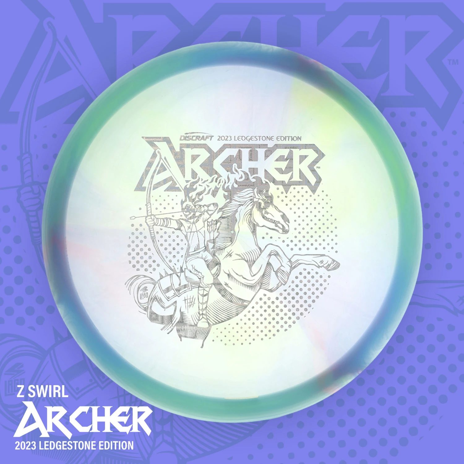 Z Swirl Archer – The Archer is the perfect disc for those shorter tee shots that really need to get on an anhyzer angle. These things are pretty understable and have a comfortable feel in the hand. The rim sits nice no matter what size your hands are, making it great for everyone. Bigger arms will be able to use it for short roller shots. The Z Swirl plastic looks amazing and is generally a fan favorite. Make sure you pick up a 2023 Ledgestone Z Swirl Archer today.